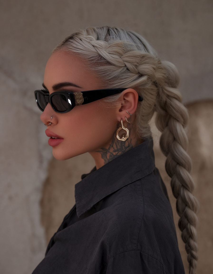 This fun and sleek braided crown flows into a long plaited ponytail, perfect for long hair. The icy blonde tone adds a bold, modern edge to the intricate braiding. It’s an aesthetic yet practical style ideal for spring outings.