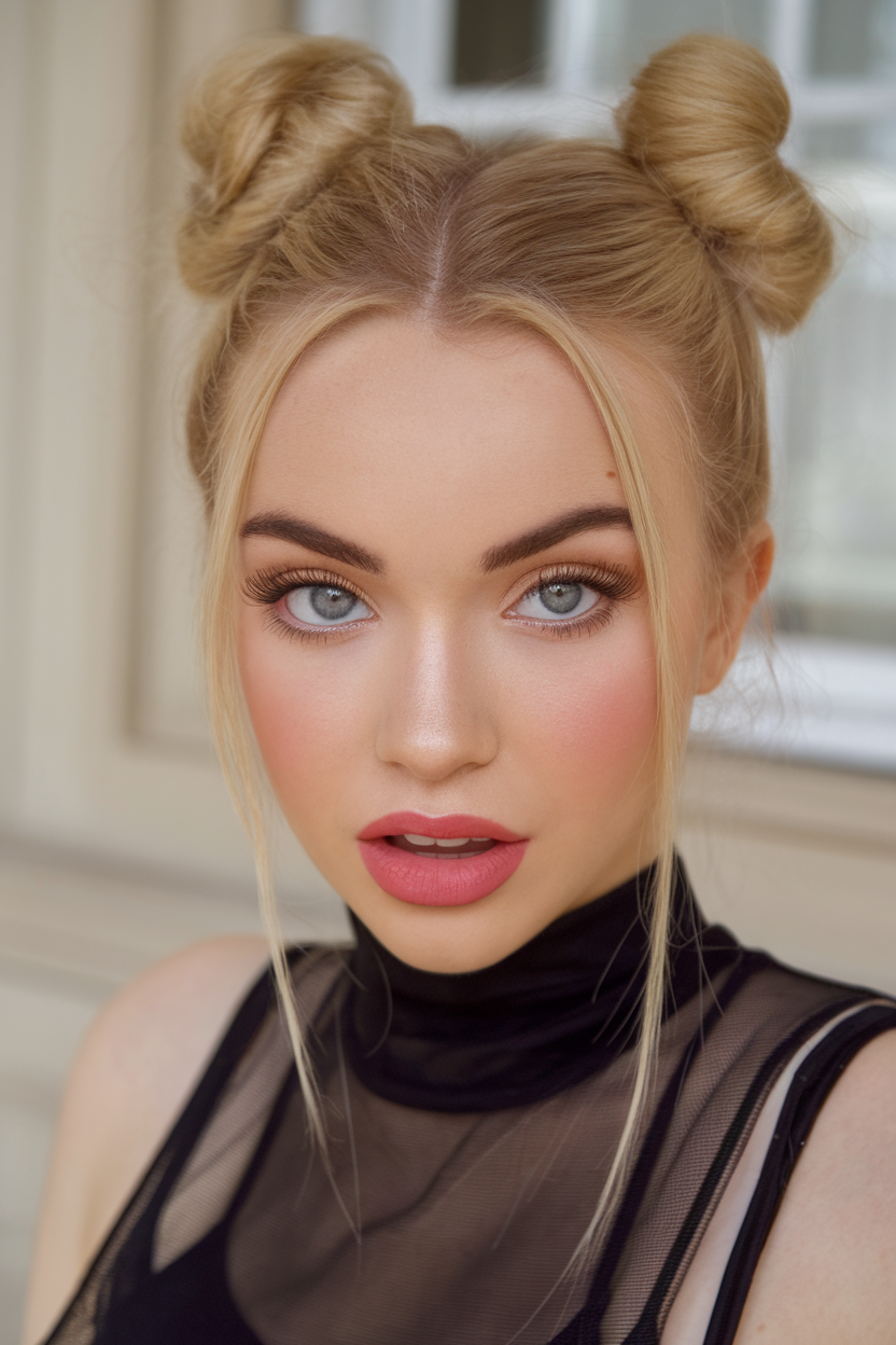 Double buns paired with soft, face-framing strands create a cute and youthful look. This style works beautifully for medium hair, blending charm with effortless appeal. The warm blonde color enhances its playful and fresh vibe.
