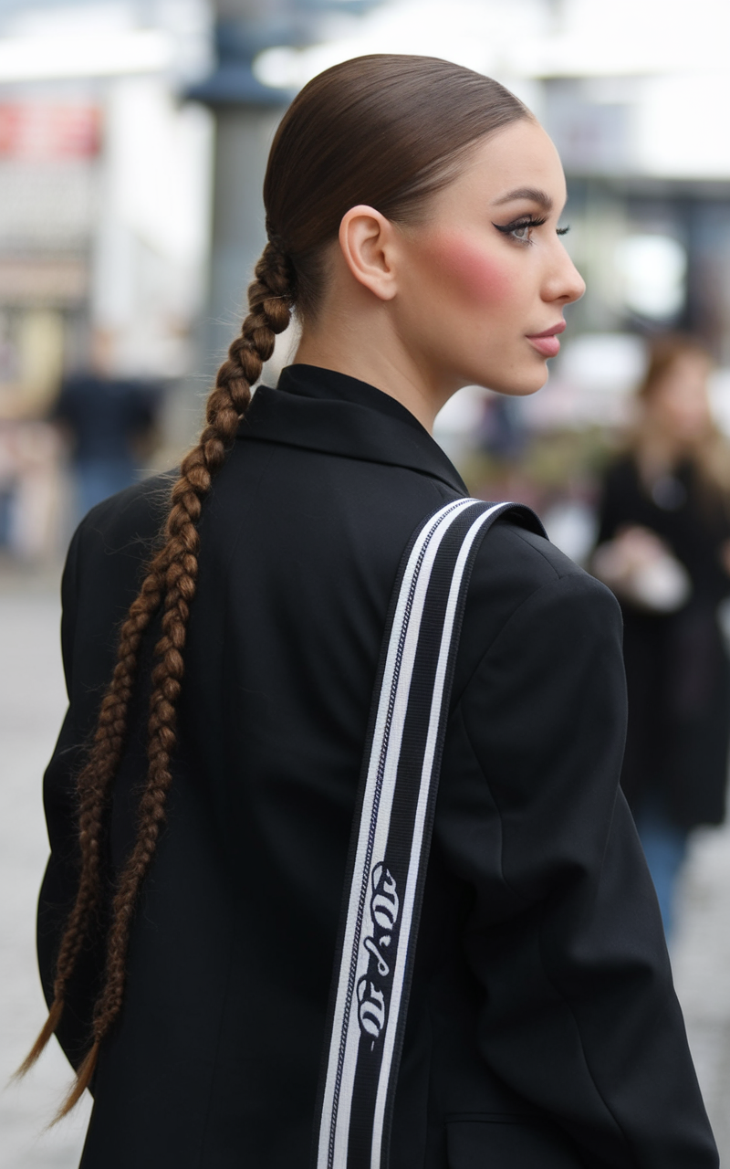 This sleek, single braid is tightly woven for a polished and clean look. The deep brown tone complements the minimal, sophisticated style, perfect for medium hair or long hair. It’s a simple yet striking hairstyle for both casual and formal spring occasions.
