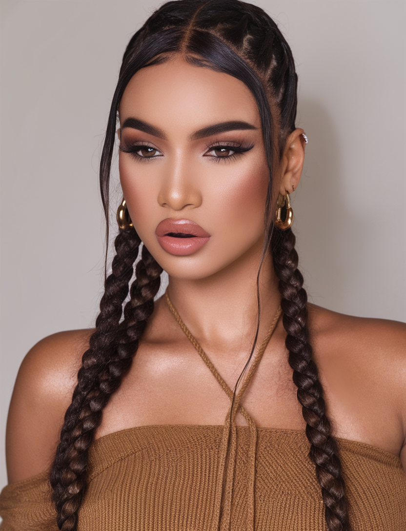 This hairstyle features sleek cornrow braids transitioning into two polished plaits. The deep brown shade highlights the intricate braiding while maintaining a chic, clean look. Perfect for medium hair, it’s both stylish and practical.