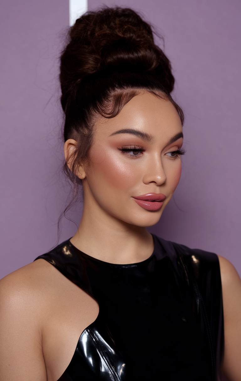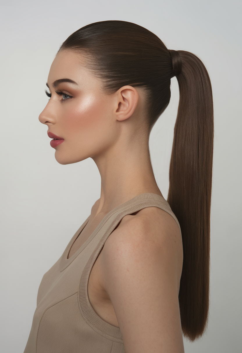 This high ponytail is smooth and sleek, showcasing a polished finish. The rich brunette tone complements the sharp structure, making it an ideal option for medium or long hair. It’s a timeless, simple look for any occasion.