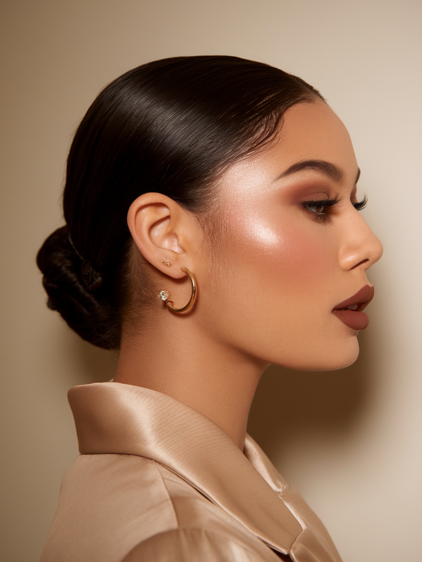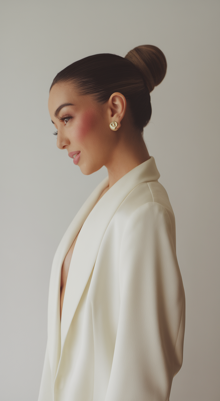 The low bun exudes elegance, crafted with a smooth, sleek texture that hugs the nape of the neck. The deep brunette shade reflects light beautifully, emphasizing the precise styling. This minimalist look is sophisticated and perfect for formal occasions.