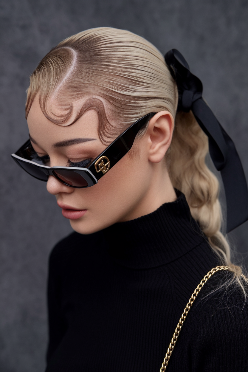 A high ponytail with precisely sculpted, gelled swirls framing the hairline, offering a vintage-modern blend. The blonde hair is tightly gathered at the back with a satin black bow, adding sophistication. This hairstyle is ideal for bold, statement-making looks.