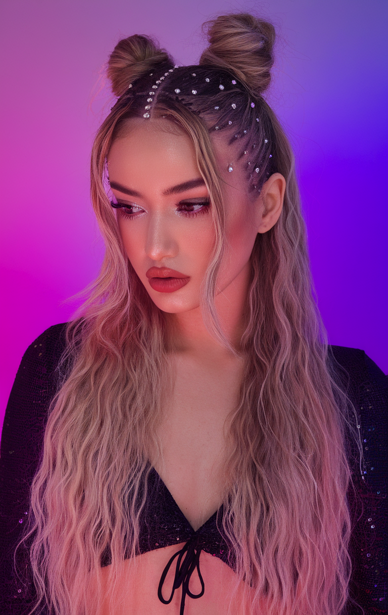 Long, wavy hair transitions into playful space buns decorated with sparkling rhinestones along the scalp. The light blonde tones with darker roots add dimension to the textured, crimped waves. This creative hairstyle exudes a fun, party-ready vibe.