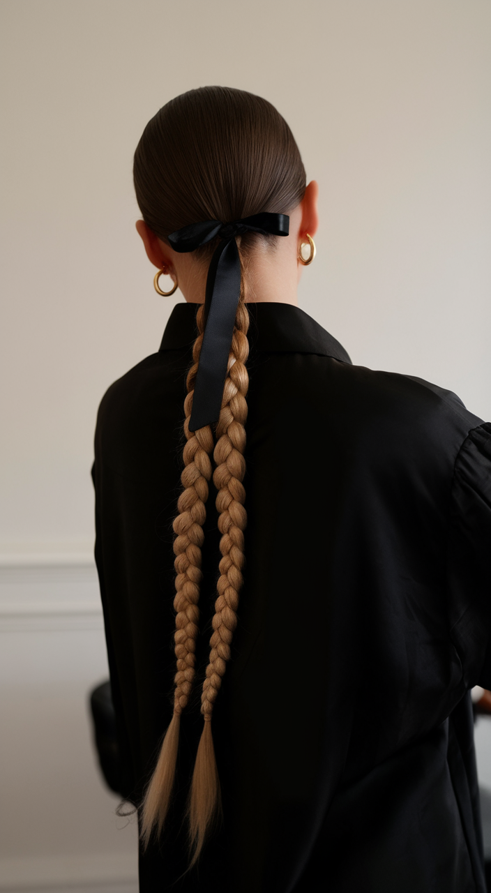 This hairstyle showcases a clean center part with two long, neatly braided plaits that extend down the back. The braids are accented with a simple black ribbon tied at the nape, adding a refined yet playful touch. The golden blonde color enhances the texture of the braids, giving them a luminous finish.