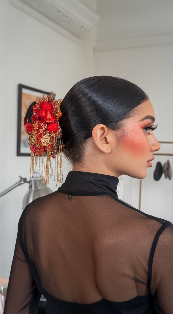 This low bun is styled to perfection, featuring a smooth base and adorned with an intricate red and gold ornament. The jet-black hair provides a striking contrast to the vibrant accessory, making the look bold and festive while maintaining a polished aesthetic.