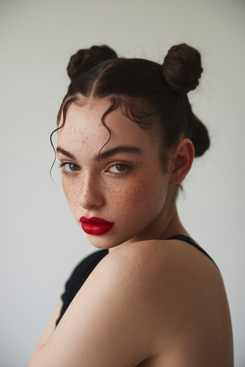 This cute and fun hairstyle features sleek double buns paired with delicate curly tendrils framing the face. Ideal for short hair or medium hair, it’s playful yet sophisticated. The natural texture of the curls enhances the overall aesthetic, making it perfect for casual or party vibes.
