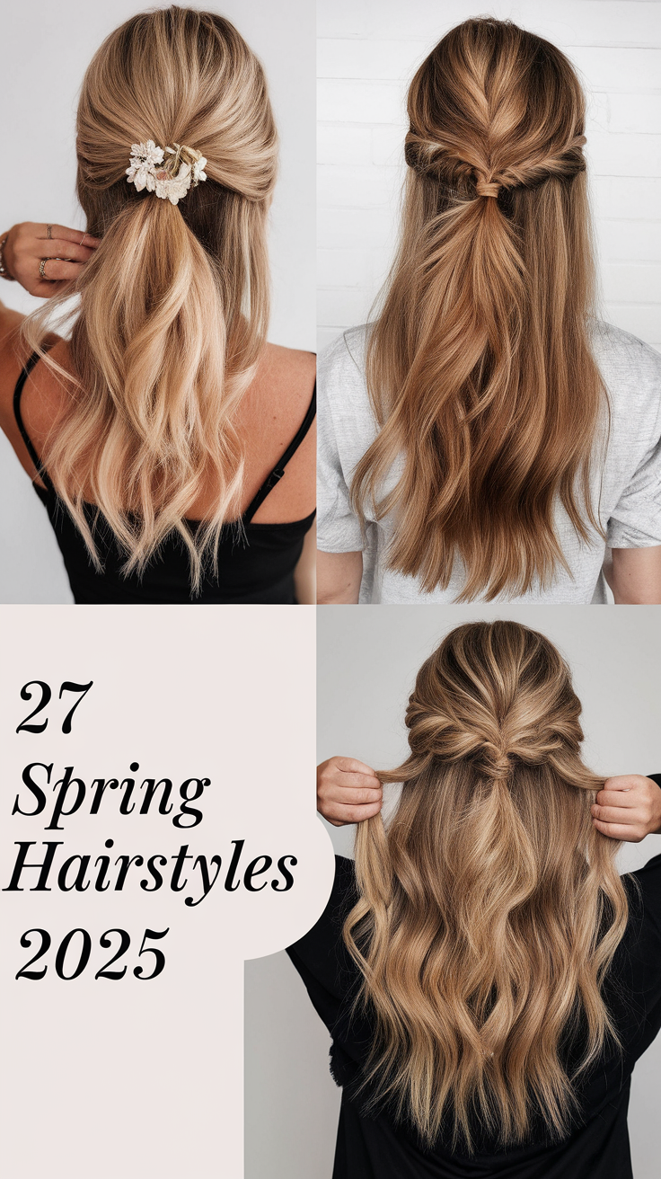 A fun half-up style paired with a sleek top knot brings attention to highlighted strands. This hairstyle combines straight hair with natural volume, making it a great option for long hair. It’s both modern and aesthetic, ideal for casual or bold spring events.