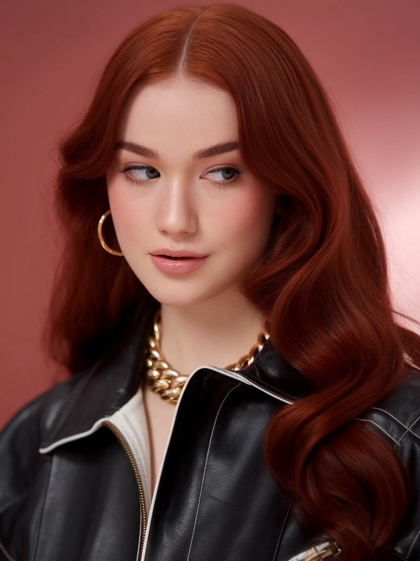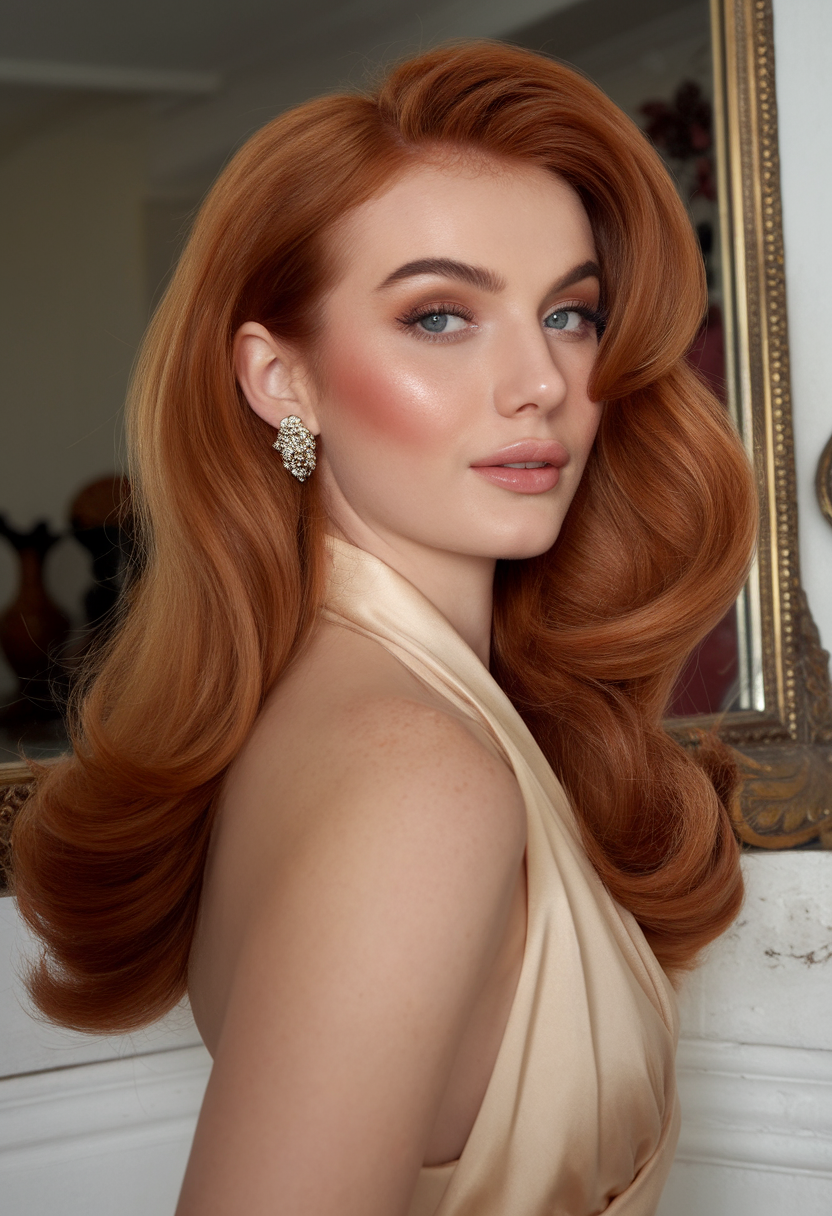 This retro-inspired auburn hairstyle features sleek, voluminous curls swept to the side for a sophisticated finish. The glossy texture and warm tones align with trends 2025 dark, making it a timeless choice for evening events. Its vintage charm adds depth to the spring 2025 style palette.