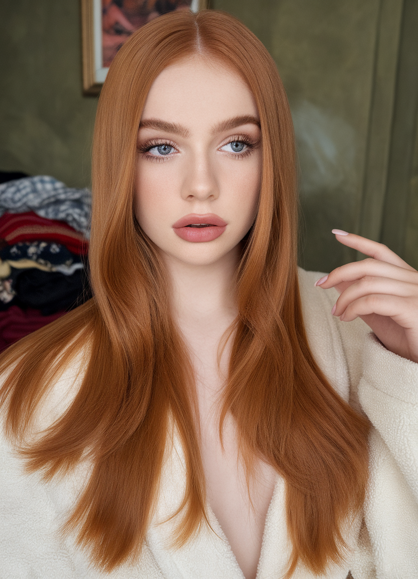 This hairstyle features a silky smooth copper shade with a precise middle part, emphasizing a polished and sophisticated look. The long, straight strands embody elegance, perfect for trends 2025 brunette medium length or trendy spring palettes. Ideal for spring 2025, this style offers a clean and timeless appearance for any occasion.
