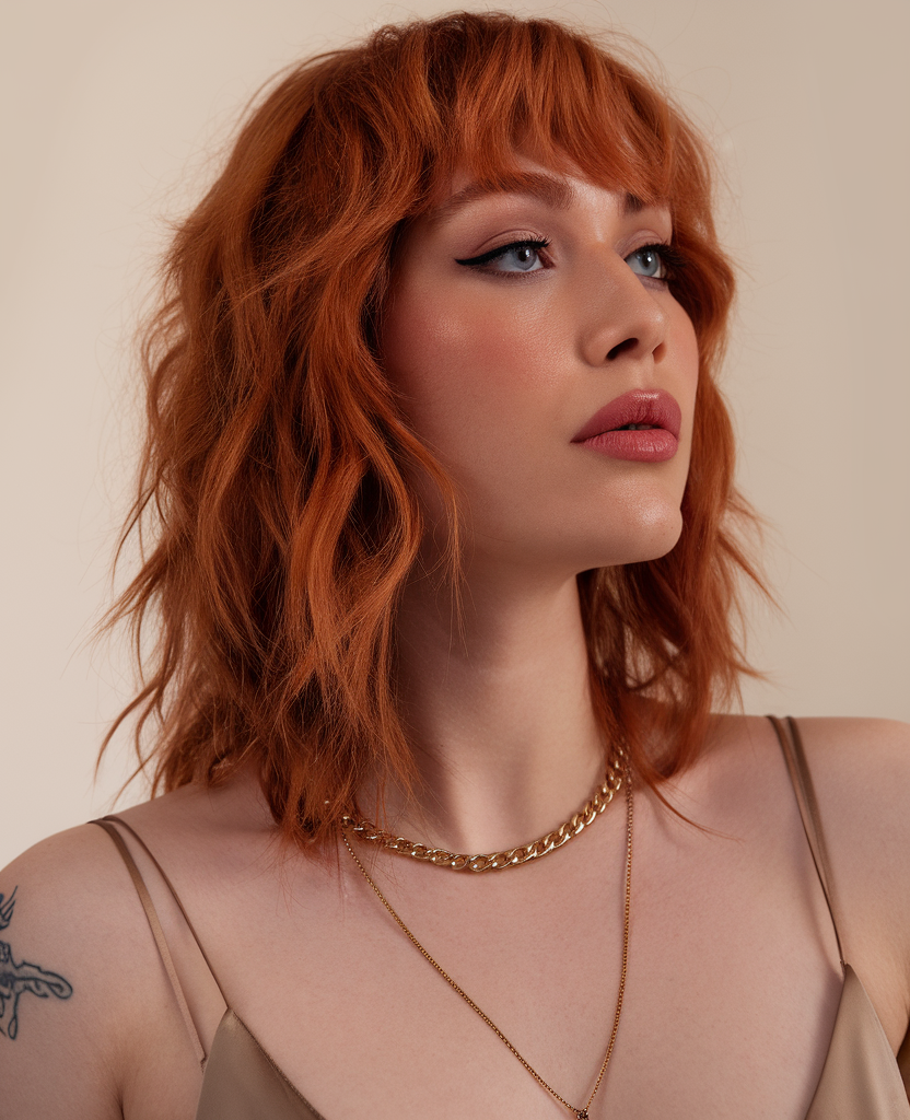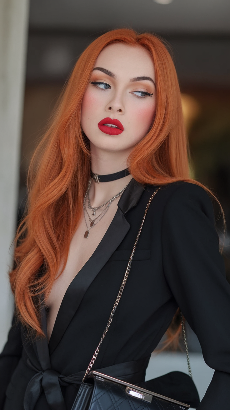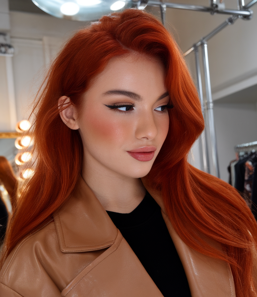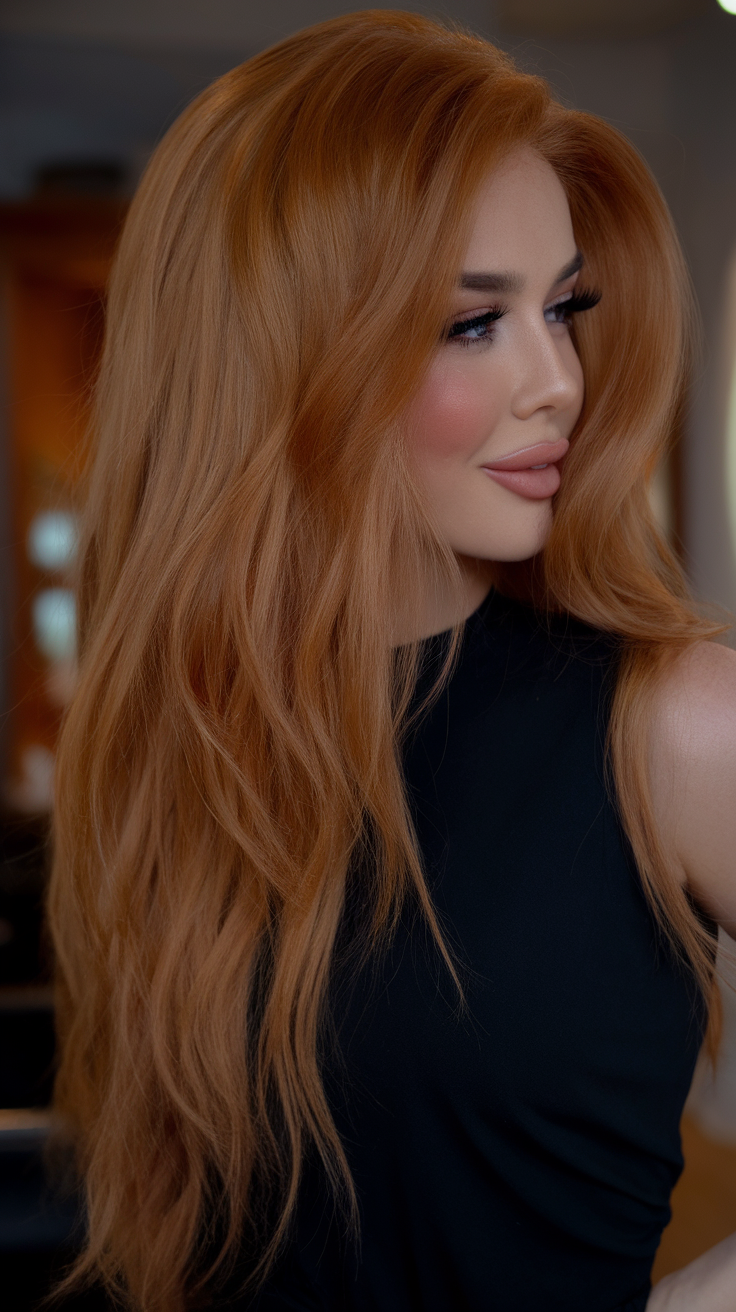 This vibrant copper hairstyle showcases long, voluminous waves with a lively, rich color. The bold shade is ideal for trendy spring 2025 looks, combining elegance with modern flair. Perfect for ideas for brunettes medium length, it’s a standout option for any occasion.