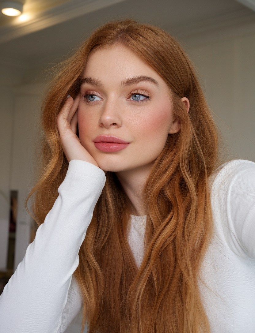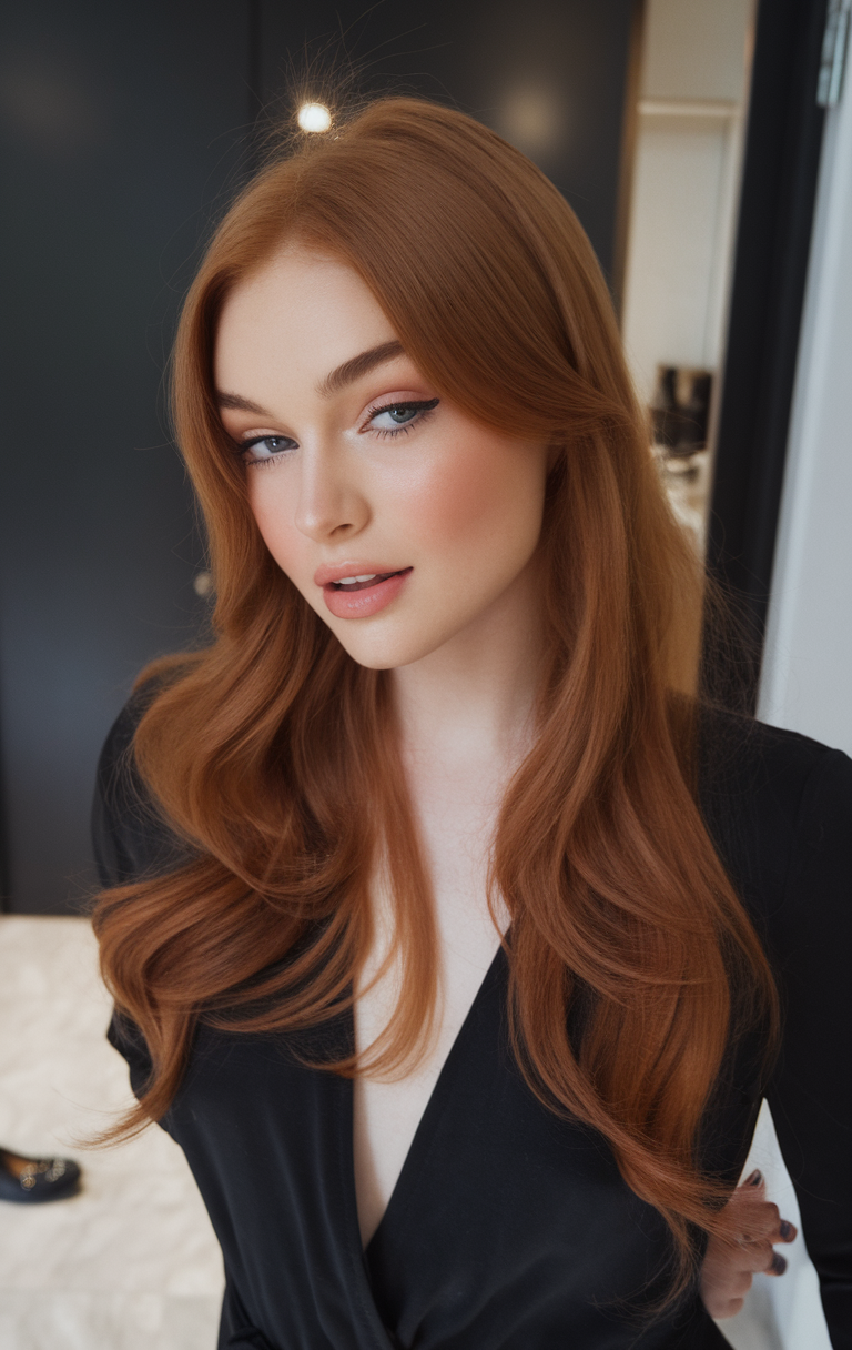 This long hairstyle showcases soft auburn waves, flowing effortlessly for a natural and radiant look. The warm tone aligns with spring red hair color 2025 and adds brightness to the trends for women brunette palette. Its understated elegance makes it a versatile option for everyday wear or special occasions.