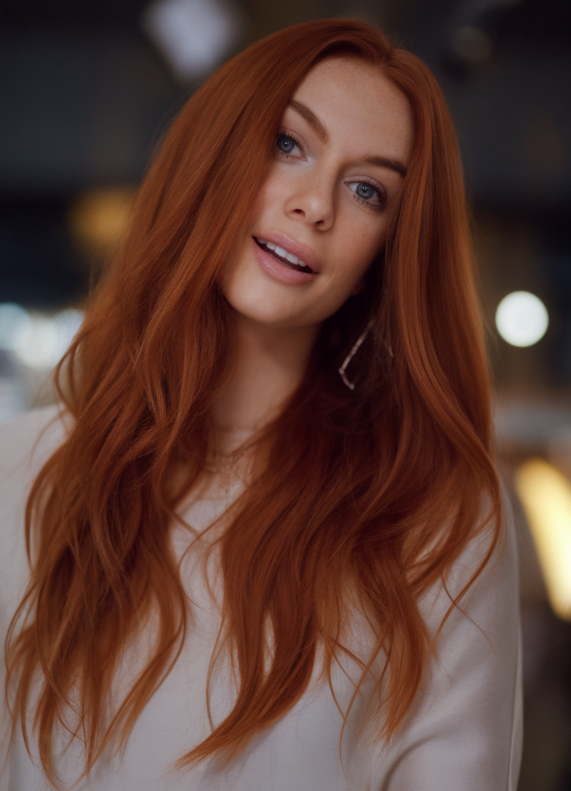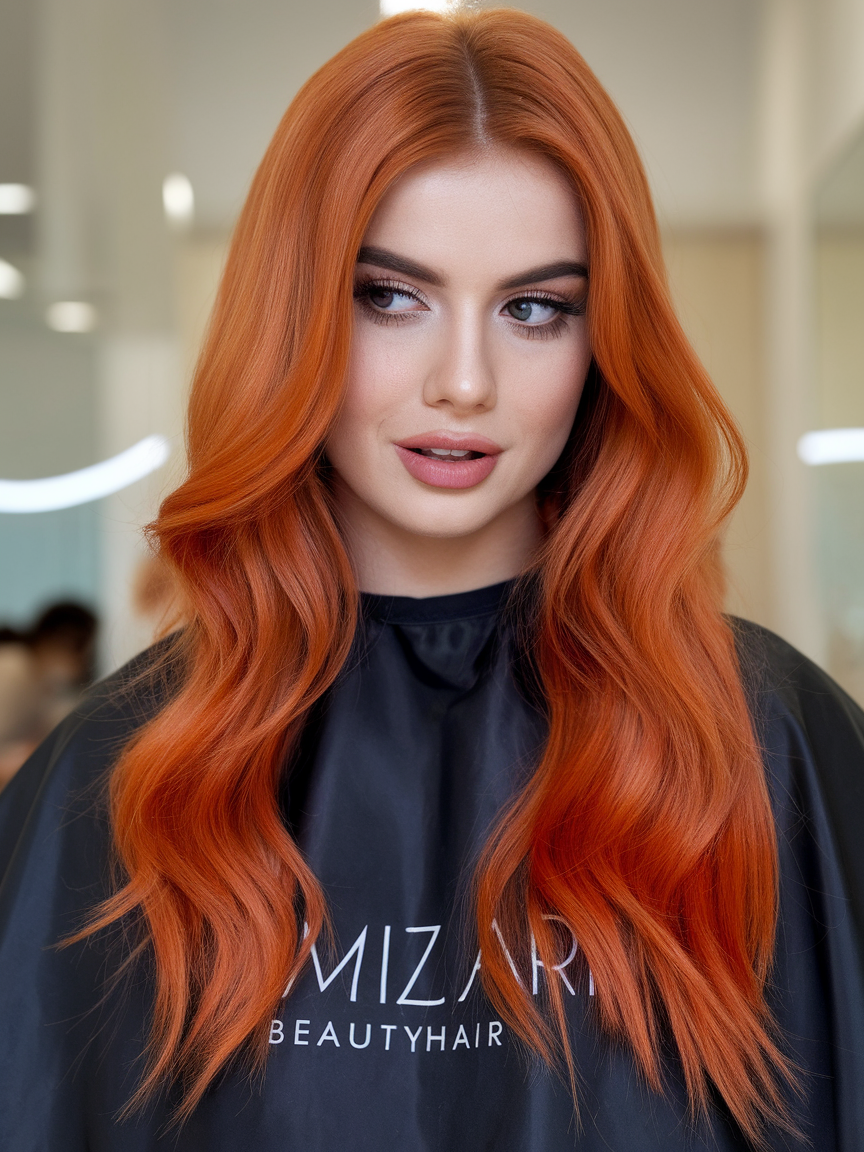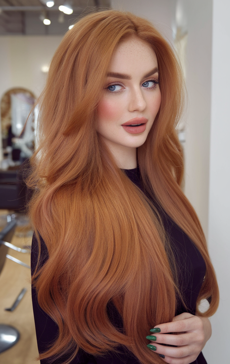 The vibrant copper hue enhances the sleek, waist-length locks, styled with a subtle center part. The polished finish highlights the natural shine, creating a radiant and bold look. This hairstyle exudes elegance and is ideal for those who love timeless, glamorous styles.
