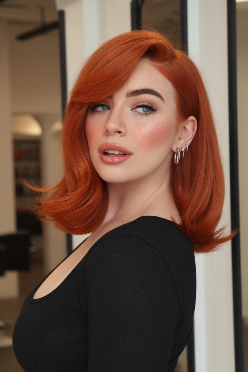 This hairstyle showcases a vibrant copper tone that radiates warmth and modern elegance. The bob cut sits just above the shoulders, with soft layers framing the face and a dramatic side-swept front section that adds volume and movement. The slightly tousled texture gives this look a playful yet polished vibe, perfect for a contemporary style statement.