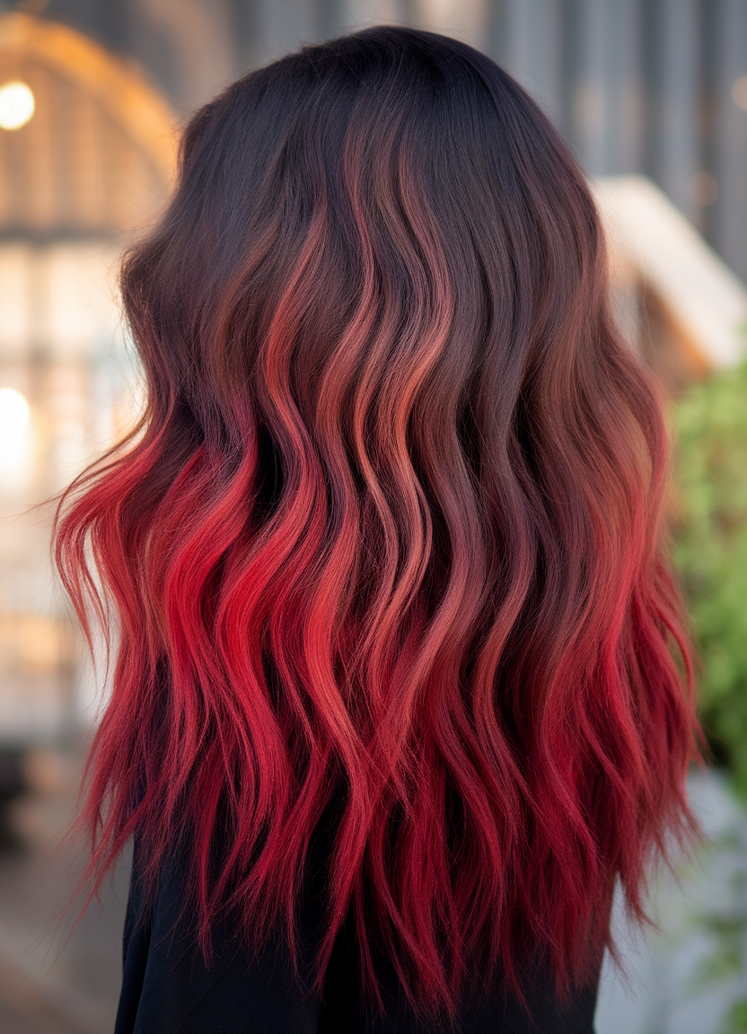 This hairstyle combines deep brunette roots with vibrant red ombre ends, creating a striking gradient effect. The soft waves add texture, making it a trendy choice for trends 2025 brunette with highlights. This bold yet natural blend is ideal for ideas for brunettes medium length seeking a dramatic finish.