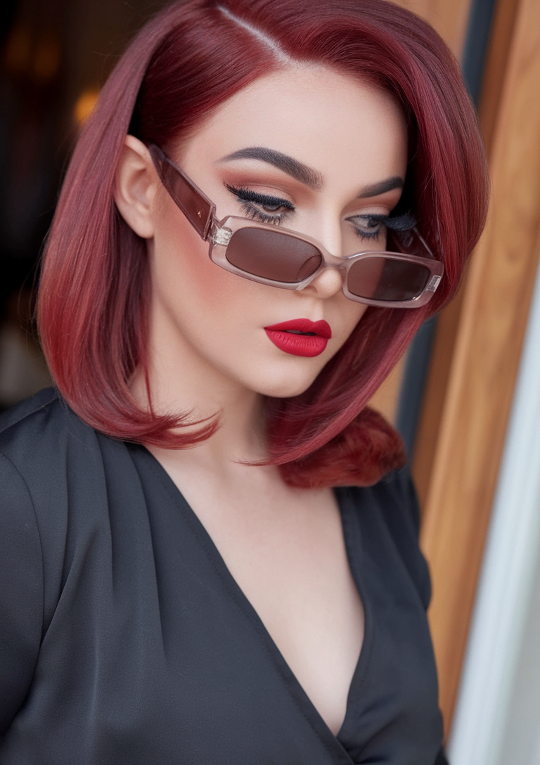This sleek bob is dyed in a bold, vibrant red and styled with a precise side part for a polished, edgy look. The sharp ends and glossy finish highlight the vibrancy of spring red hair color 2025 and work well with trends for women brunette. This contemporary cut is perfect for anyone seeking a statement-making hairstyle.