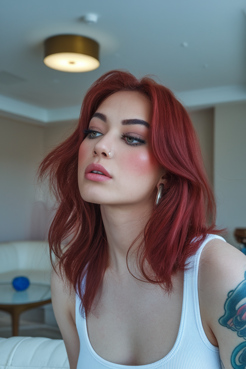 This shoulder-length lob is dyed a rich, warm red and features soft, feathered layers. Styled with loose waves, it adds movement and volume, giving a modern edge to a classic cut. The relaxed look makes it versatile for both casual and semi-formal occasions.