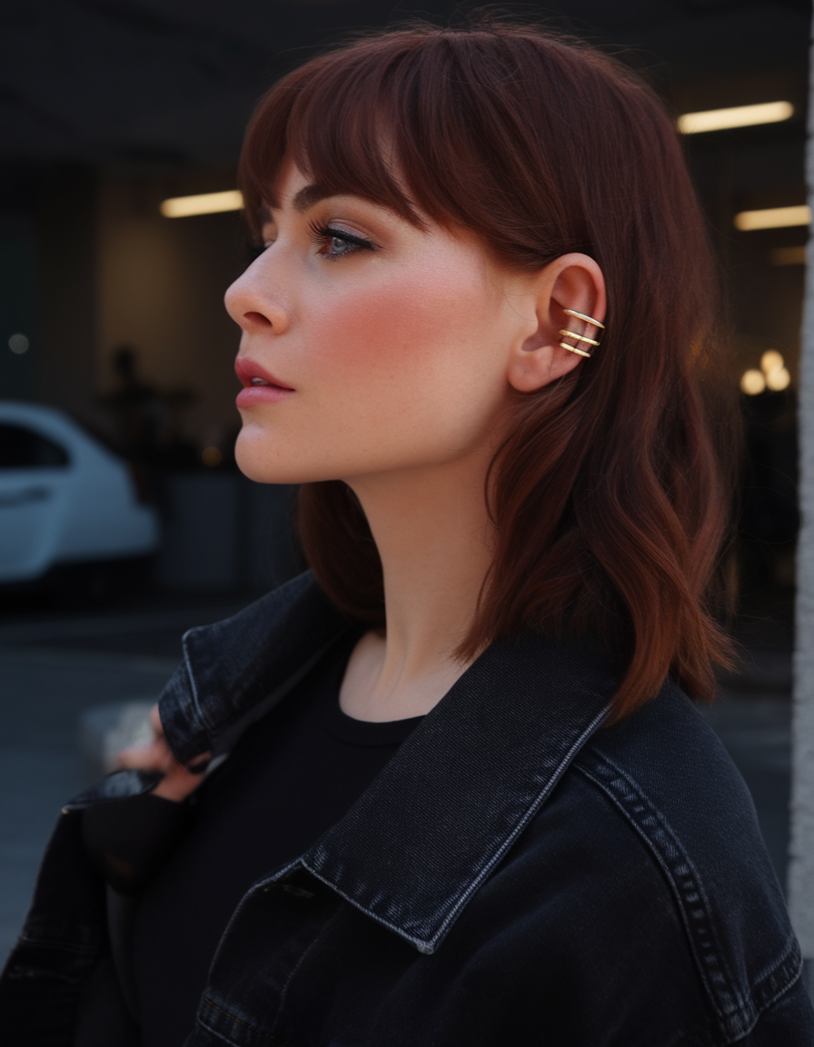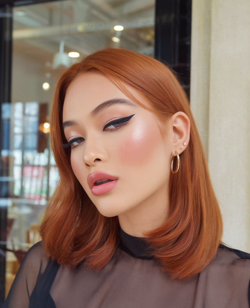 This polished copper bob features a sleek cut with side-swept bangs, creating a bold yet elegant look. The vibrant hue enhances the depth and warmth, perfect for trends 2025 brunette medium length. Its structured style makes it a standout choice for a sophisticated spring 2025 aesthetic.