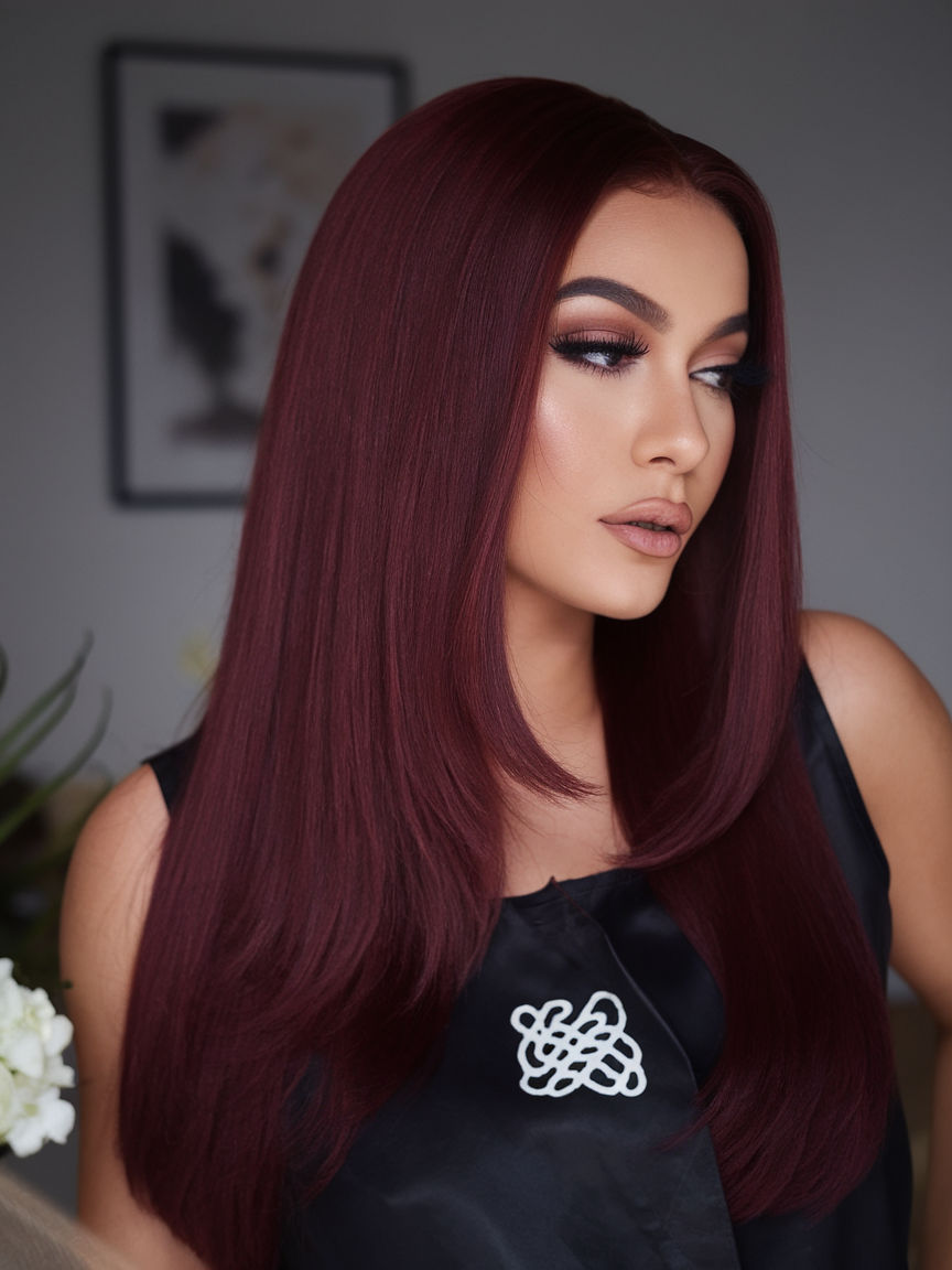 A sleek burgundy tone takes center stage in this polished, mid-length hairstyle. The center part emphasizes symmetry, while the smooth, precision cut delivers a modern and glamorous finish that radiates confidence.