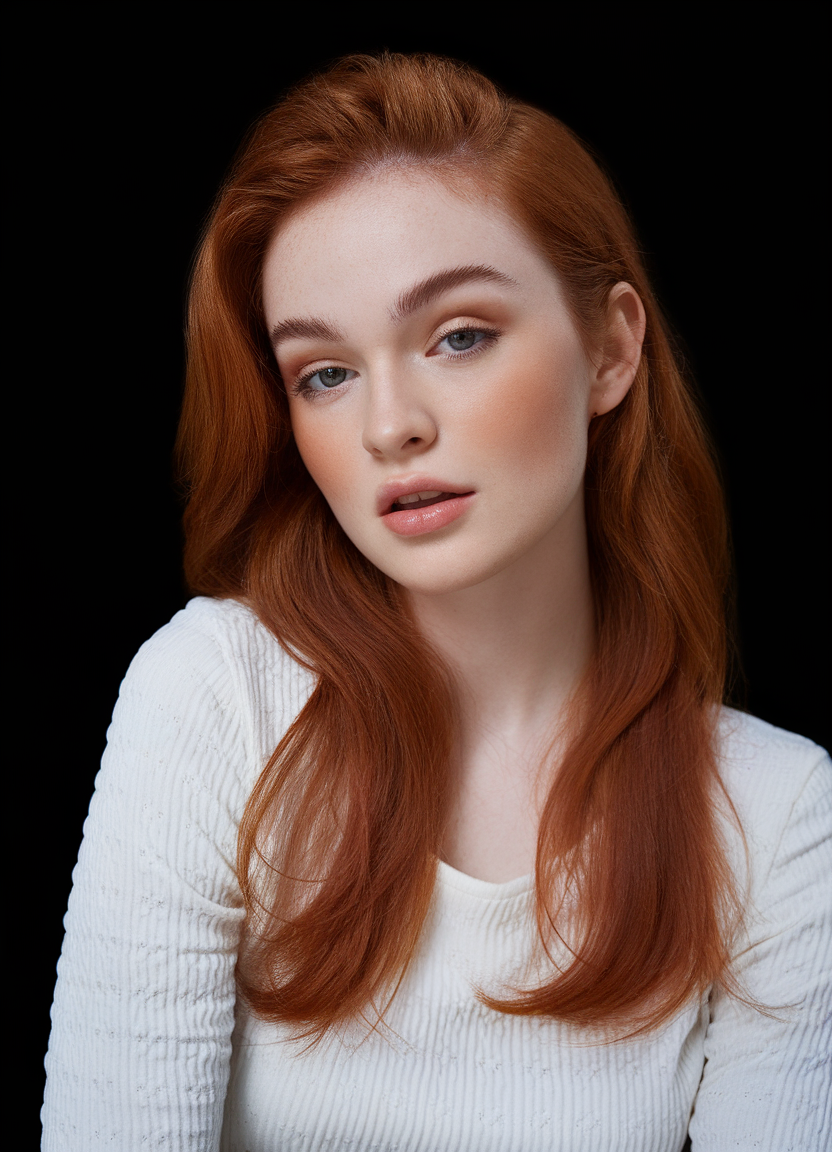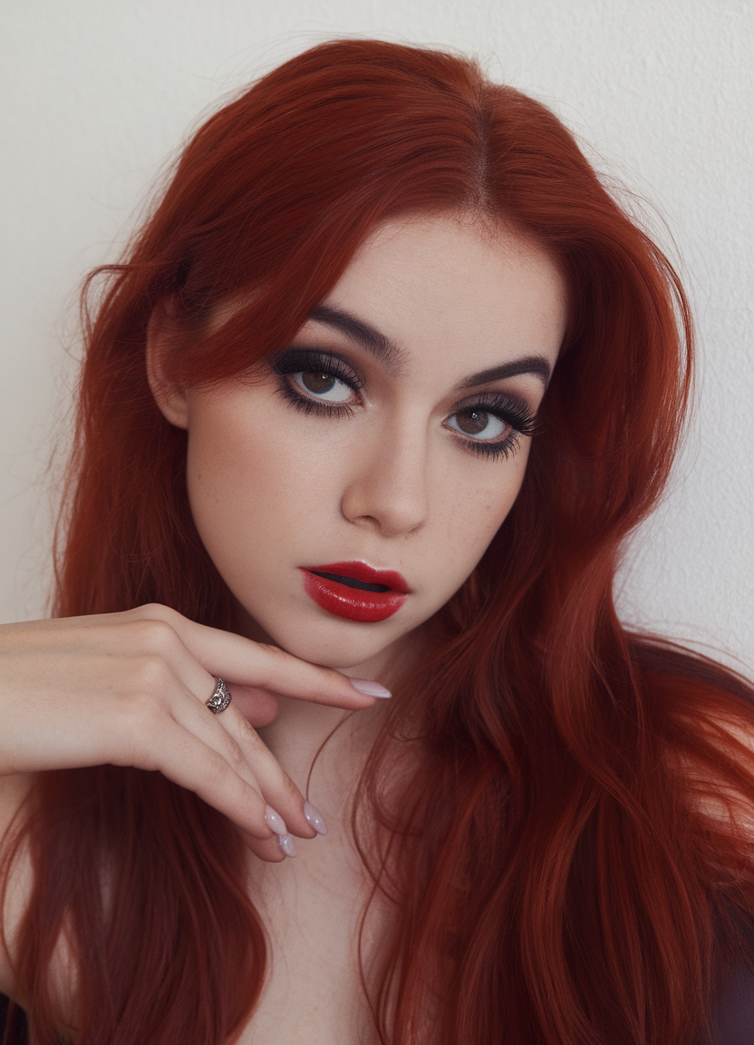 This rich auburn hairstyle falls gracefully past the shoulders, exuding timeless sophistication. The soft, sleek waves paired with a subtle lift at the crown create a balanced and elegant silhouette. The color, a deep auburn with warm undertones, enhances the natural glow and perfectly complements the simple, polished cut.