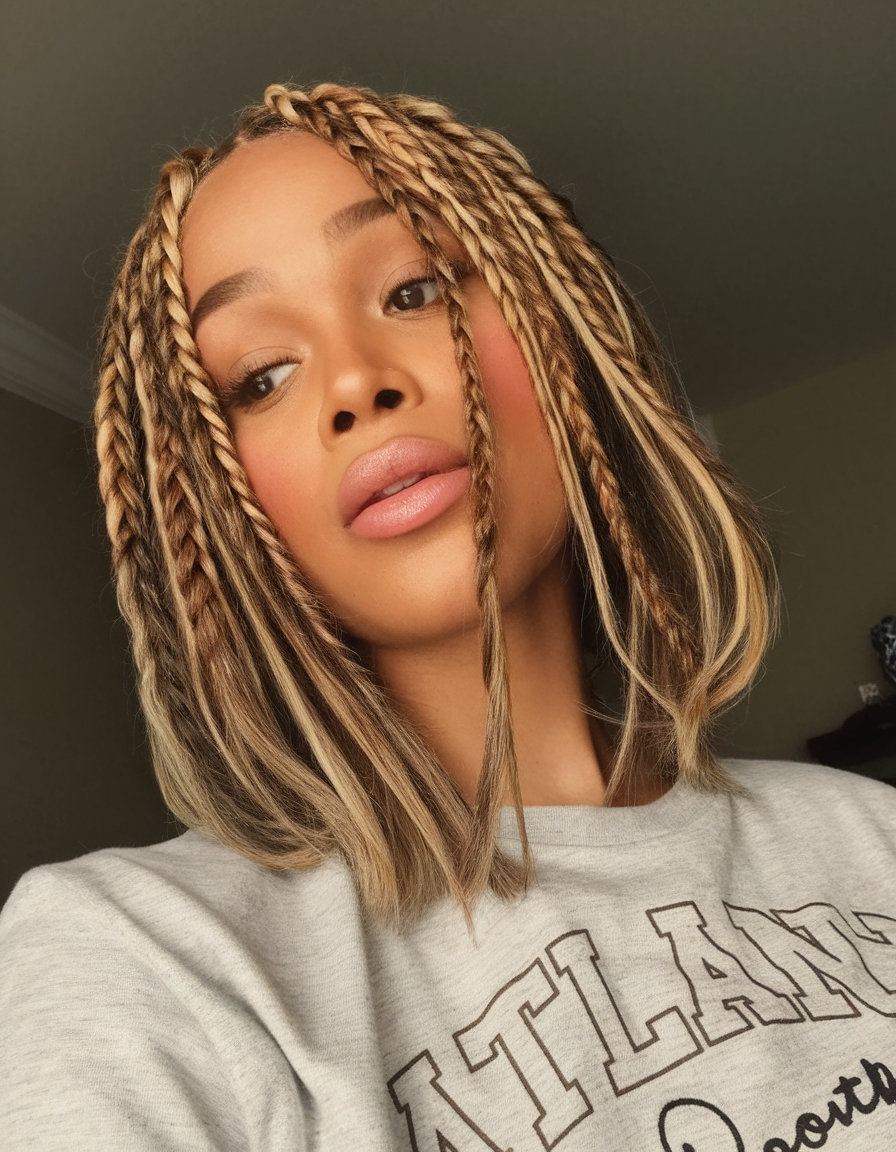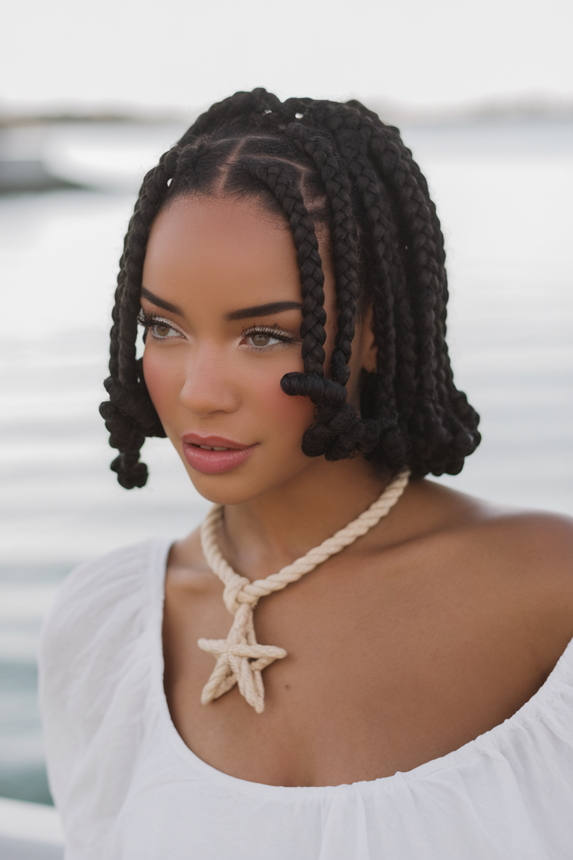 This short bob features chunky spring twists styled into retro-inspired curls at the ends. The twists are neatly parted and fall just at chin length, framing the face beautifully. This playful yet polished style is a perfect choice for anyone looking for a fresh take on a classic bob.