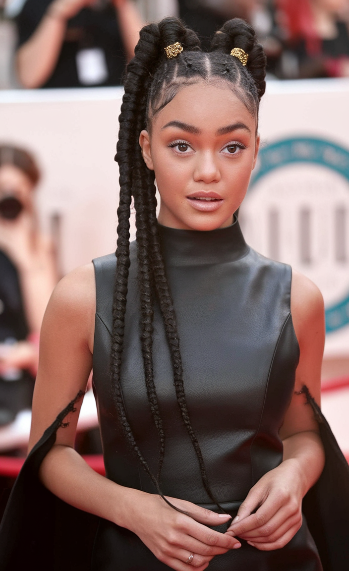 This edgy hairstyle combines high ponytails with thick spring twists, enhanced by golden cuffs for added flair. The twists cascade down while the ponytails emphasize height and drama. It’s an ideal choice for formal events or bold, standout looks.