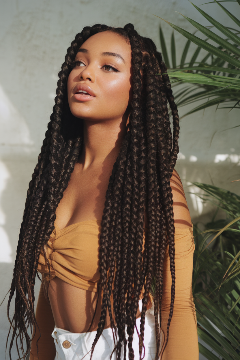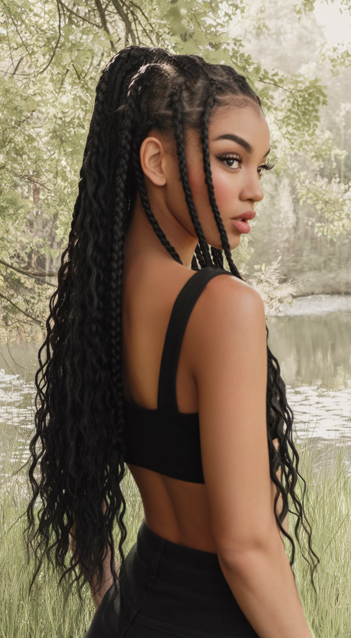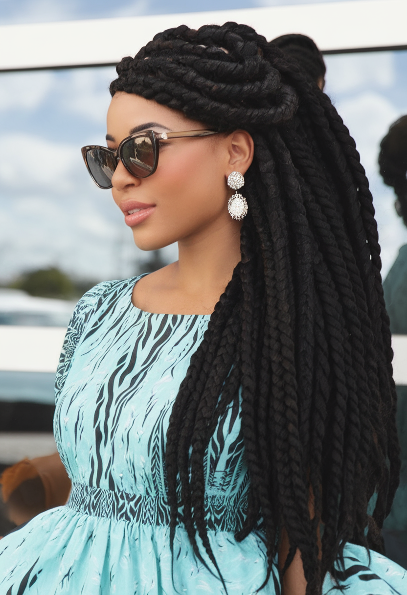 This style features long spring twists pulled into a high ponytail, with loose, wavy ends for added texture. The twists are sleek at the roots, enhancing the natural beauty of the hair while offering a playful, dynamic look. Perfect for outdoor events, this hairstyle combines elegance and movement effortlessly.