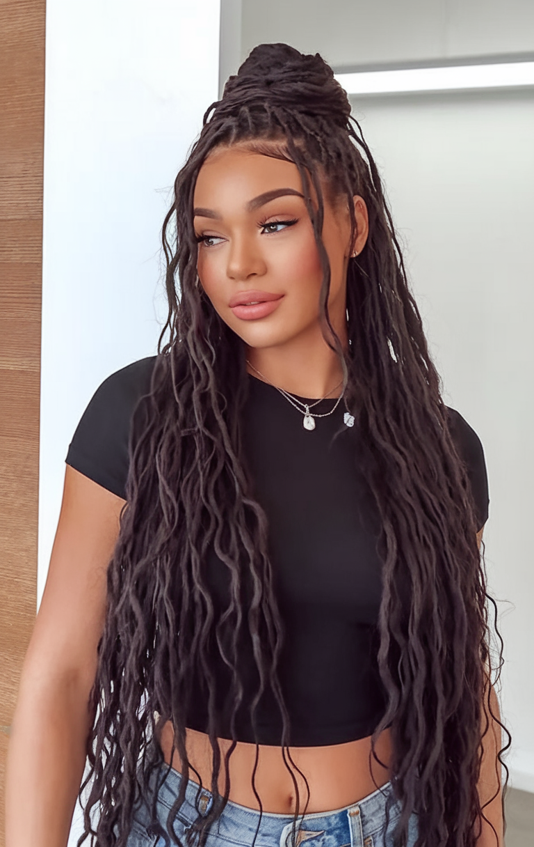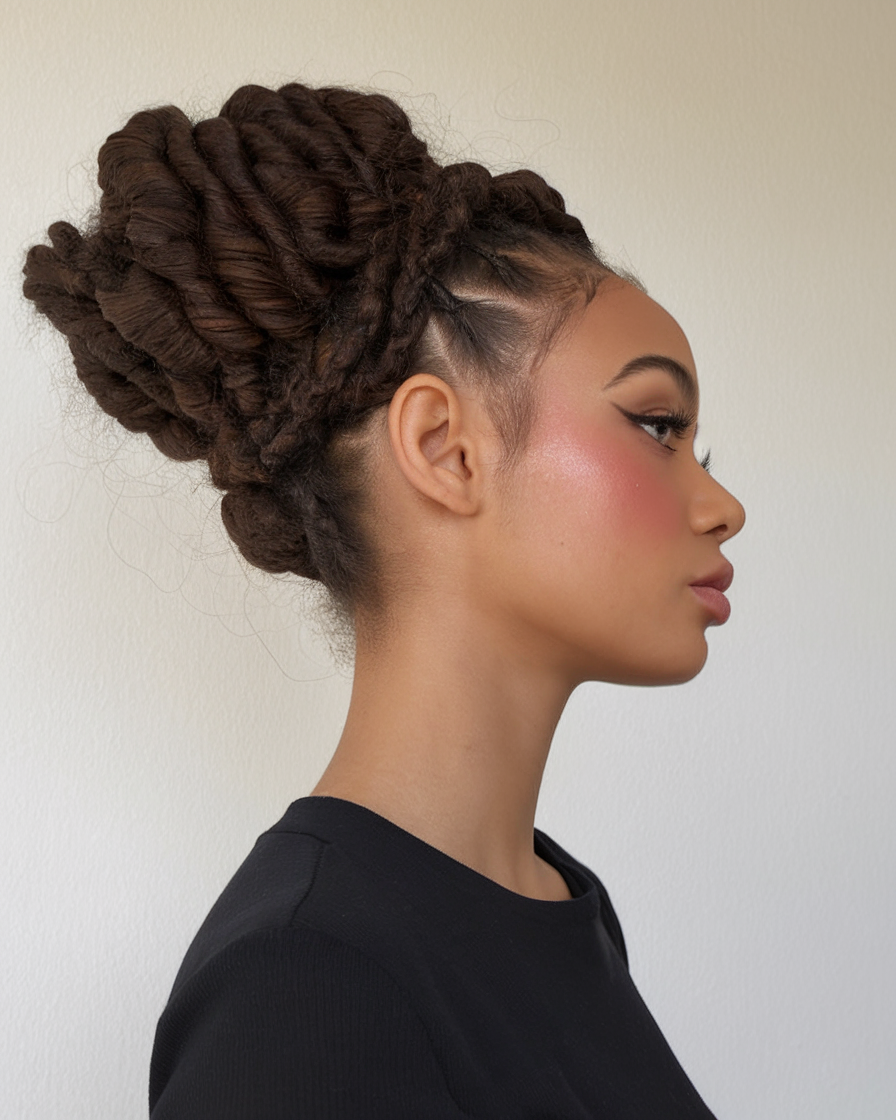 A high bun created with thick, twisted locks in a deep brown shade. The intricate bun is complemented by loose curls framing the face, adding softness to the bold updo. This style is ideal for formal occasions or an elevated casual look.