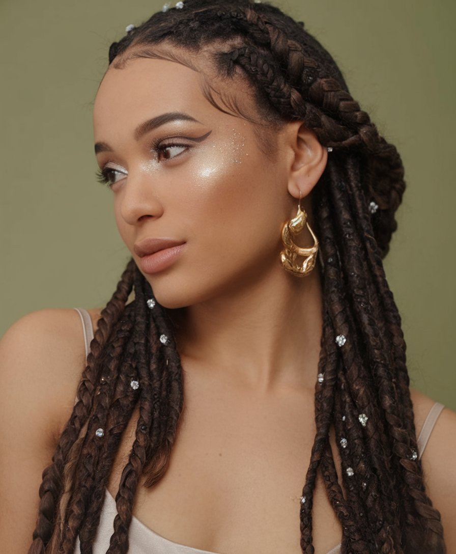 This style features medium-length spring twists embellished with sparkling rhinestones for an added touch of glamour. The twists are neatly sectioned, with some strands framing the face to create softness. This look is ideal for elegant evening events or formal occasions.