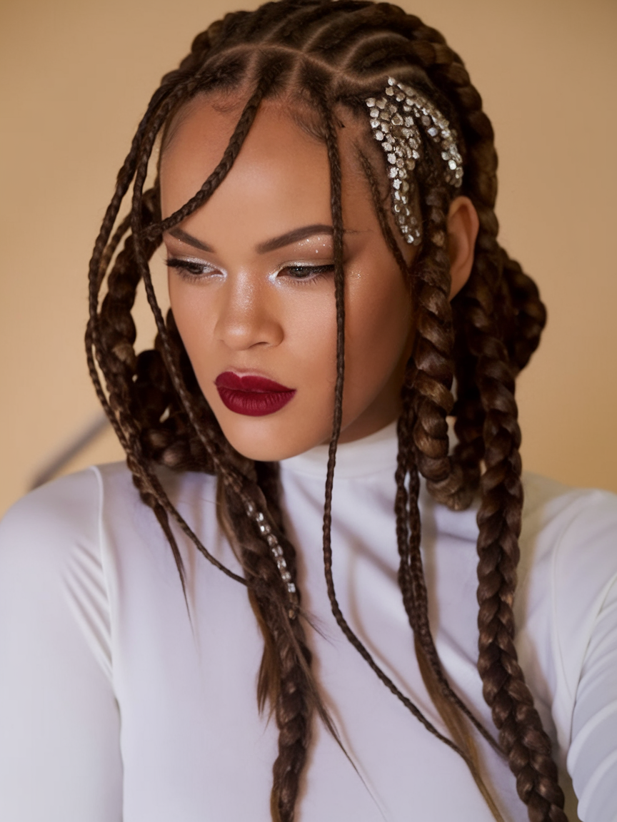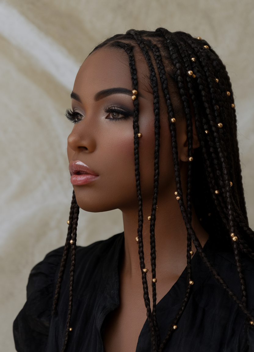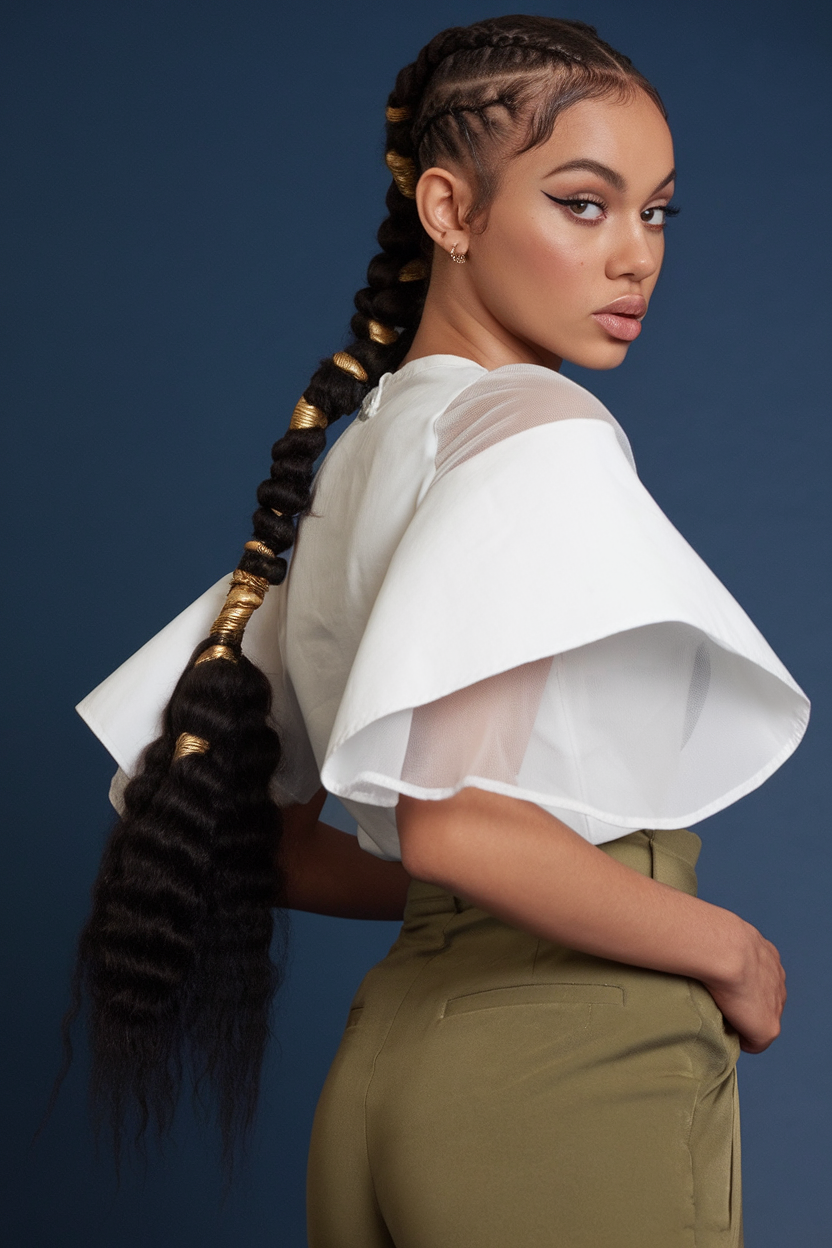 This extra-long braided ponytail combines tightly woven twists with loose, textured ends for a dramatic finish. Gold accents are strategically placed throughout the braid, adding a regal and eye-catching detail. The style is perfect for bold statement looks or special occasions.