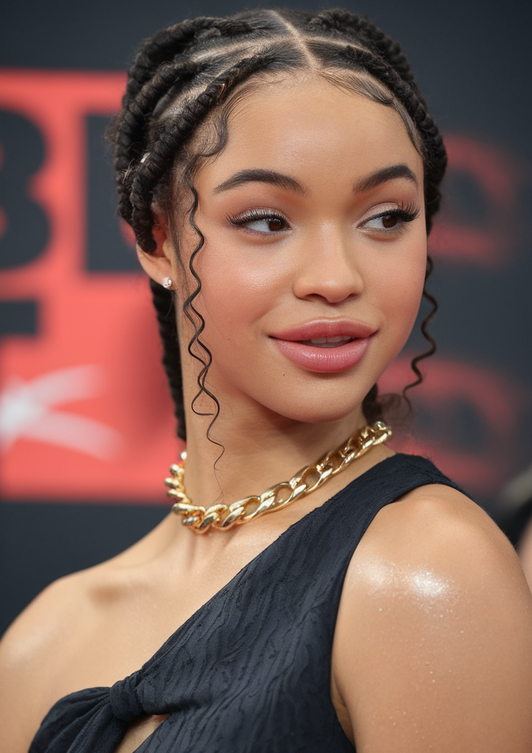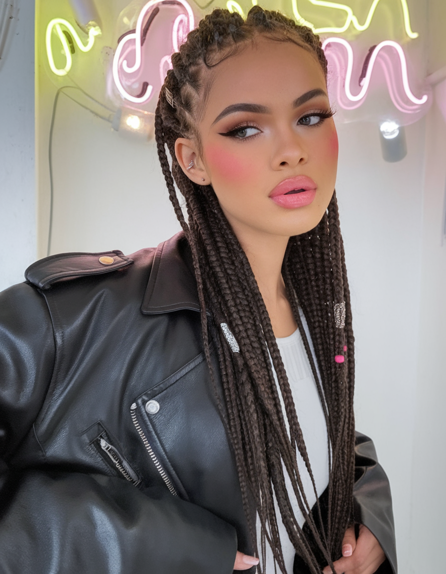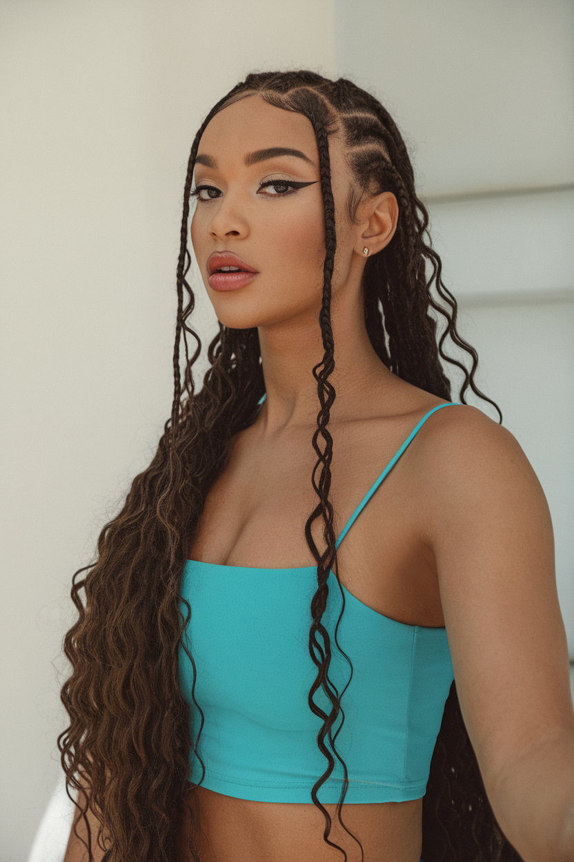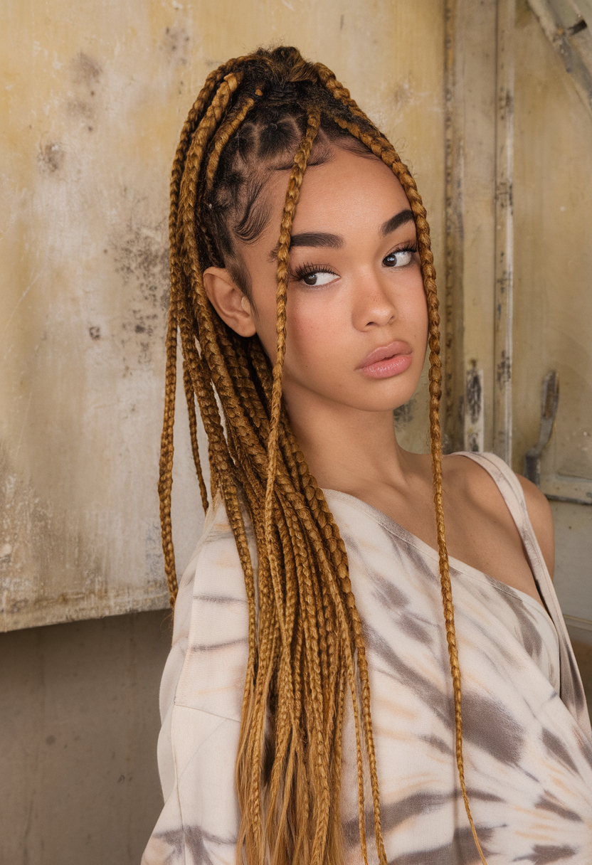 This extra-long braided ponytail combines tightly woven twists with loose, textured ends for a dramatic finish. Gold accents are strategically placed throughout the braid, adding a regal and eye-catching detail. The style is perfect for bold statement looks or special occasions.