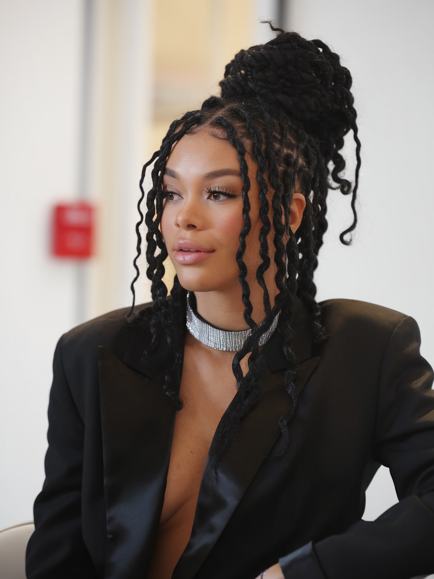 This long spring twists hairstyle combines free-flowing length with a stylish half-up bun. The Ghana-inspired lines at the roots add detail, while the twists cascade down for a dramatic effect. To style, secure the bun and let the remaining twists flow naturally.