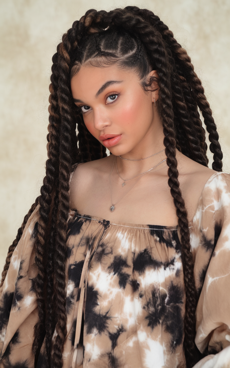 Thick, rope-like twists in a rich chocolate brown shade fall over the shoulders in this voluminous style. The defined twists are complemented by a natural part, creating a balanced and effortless bohemian look. This hairstyle is both low-maintenance and eye-catching.