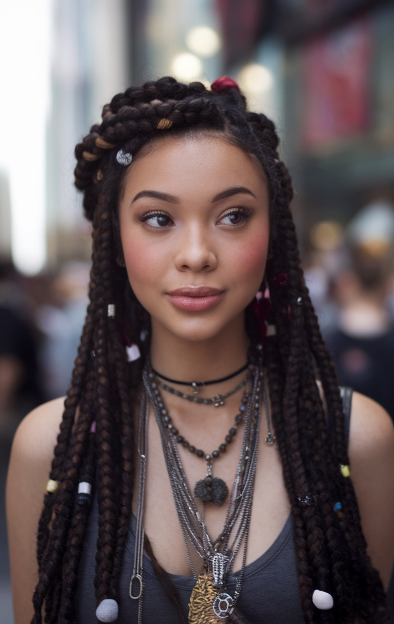 This style features long spring twists adorned with beads and colorful wraps, creating a playful and bohemian vibe. The twists cascade naturally, complementing natural hair while allowing for creative expression through accessories. Perfect for festivals or casual outings, this look combines charm with effortless styling.