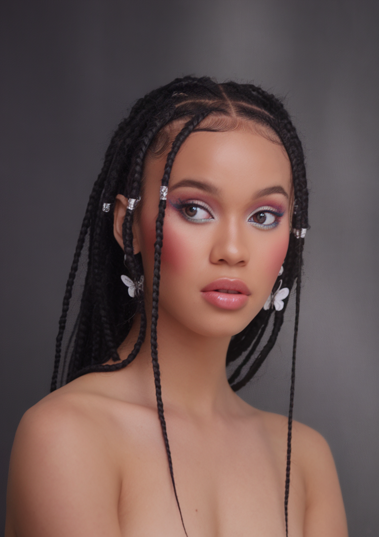 These sleek micro twists are accented with silver butterfly clips, giving a delicate and whimsical touch to the look. Falling just past the shoulders, the neat twists are parted precisely, highlighting the wearer’s features. This cute and natural hairstyle is ideal for formal events or minimalistic elegance.