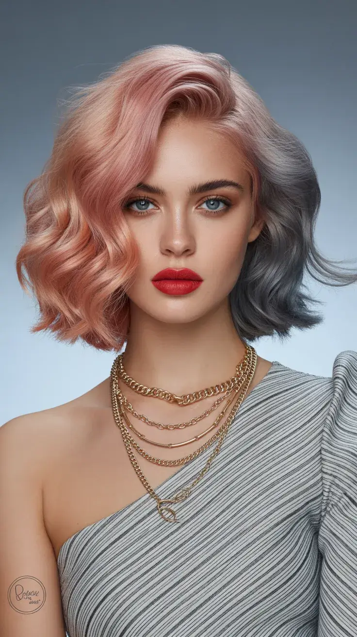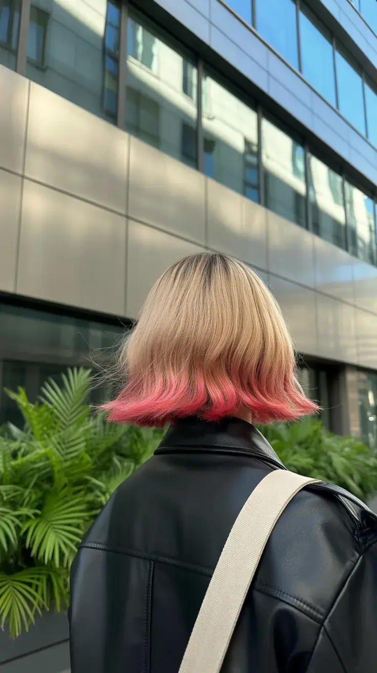And then suddenly – fun. A classic Blonde bob gets flipped with a soft pink dip at the ends, almost like a modern Calico twist. It’s unexpected but not loud, playful but still wearable. That slight flick at the ends makes the color pop even more.