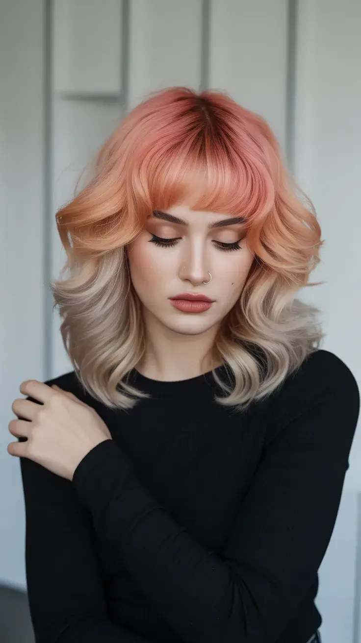 I didn’t expect to fall for this one, but here we are. A delicate mix of peach and creamy blonde that almost melts into itself, with airy bangs that soften everything. It’s giving light Ginger energy without going full copper, which makes it feel wearable for everyday Summer moods.