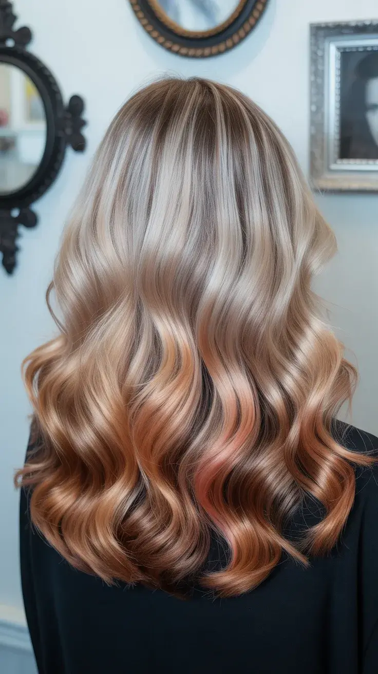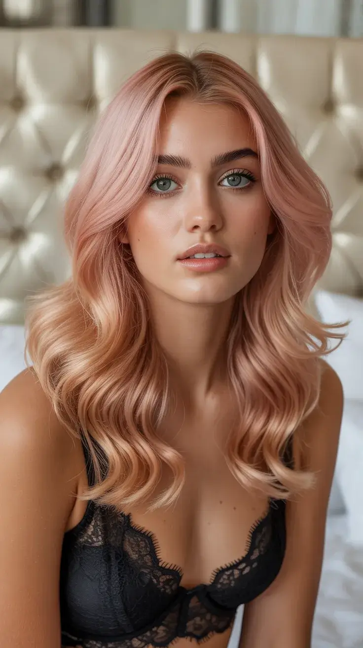 This shade sits right between playful and polished – a muted rosy Blonde that feels fresh but not loud. The soft waves make it glow, almost like the color is lit from within.