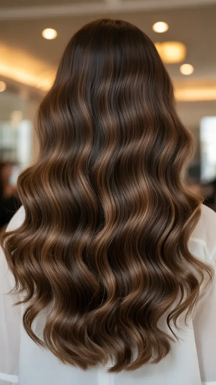 If you’ve been searching for Ideas for brunettes, this is it. A rich blend of caramel and Chocolate brown tones that catch the light in all the right places. The waves add depth, but it’s really the color placement that makes this feel alive.