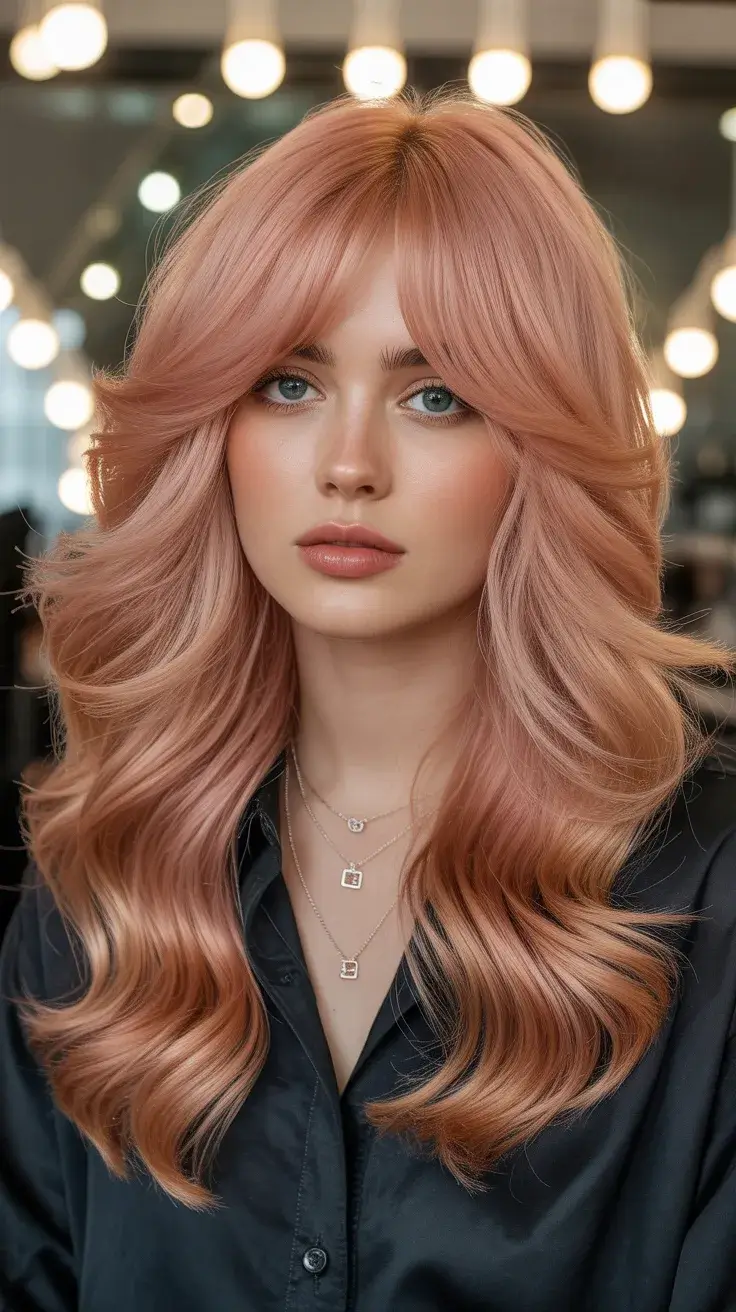There’s something about this airy, feathered layering paired with that delicate peach-rose tone that feels almost cinematic. It’s not quite Red, not quite Blonde – it sits right in that dreamy in-between, like melted sorbet at golden hour. The long, cascading layers give movement without trying too hard, and those curtain bangs? They soften everything. I love how this kind of Colored finish doesn’t scream – it glows.