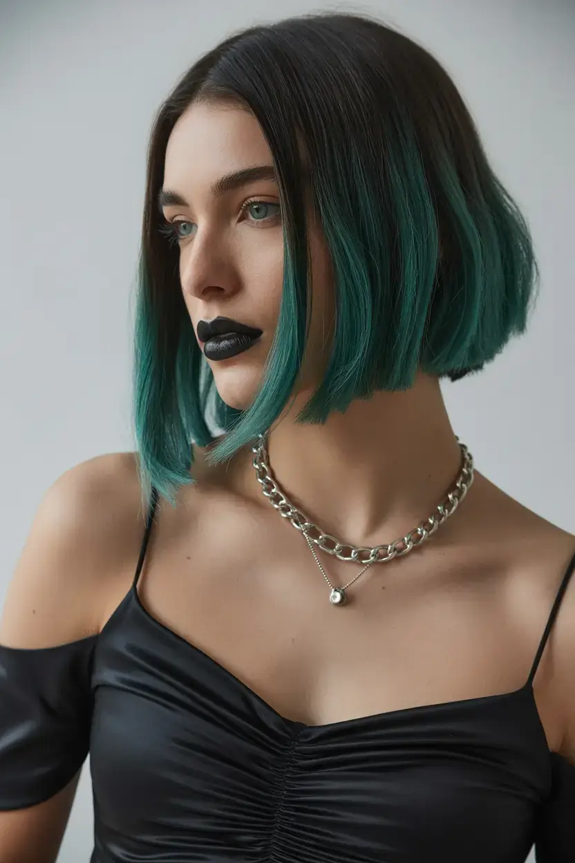 Okay, this one? Completely different energy. Sharp, graphic, a little rebellious. The blunt bob paired with that deep teal melt gives serious Edgy girl energy without crossing into costume territory. It’s bold, yes – but still wearable, especially if you keep the roots dark and natural.