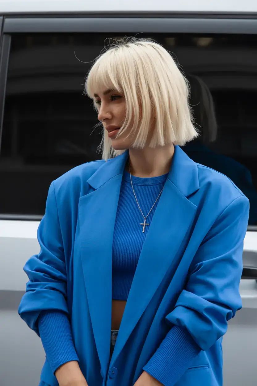 Something about this ultra-clean Blonde bob feels like a reset button. The lines are sharp but not harsh, softened by that creamy, almost vanilla tone that sits right between icy and warm. I love how the blunt ends contrast with the airy fringe – it’s structured, but still moves. Paired with that tailored blue blazer moment, it leans a little Edgy, a little minimalist, very now.