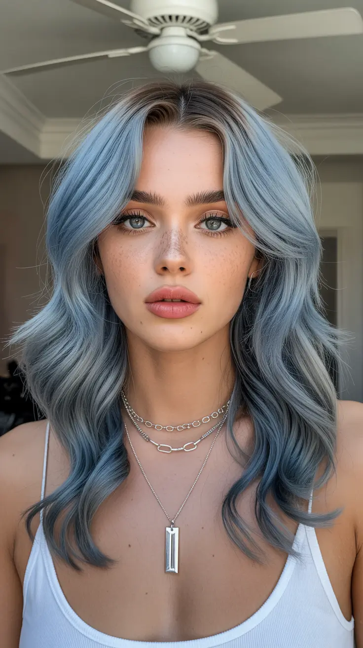 There’s something almost hypnotic about this shade. A smoky, desaturated blue that feels soft instead of loud. Paired with loose, Curly waves, it reads more romantic than rebellious – like a quiet kind of statement.