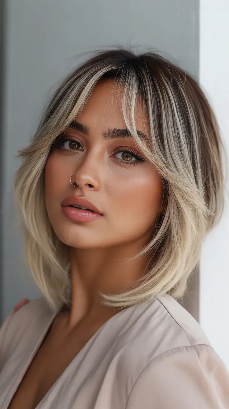 This one is bold in a completely different way. Clean, bright, unapologetically cool. The icy platinum tone paired with structured layering gives that sharp, editorial finish – but the softness around the face keeps it wearable.