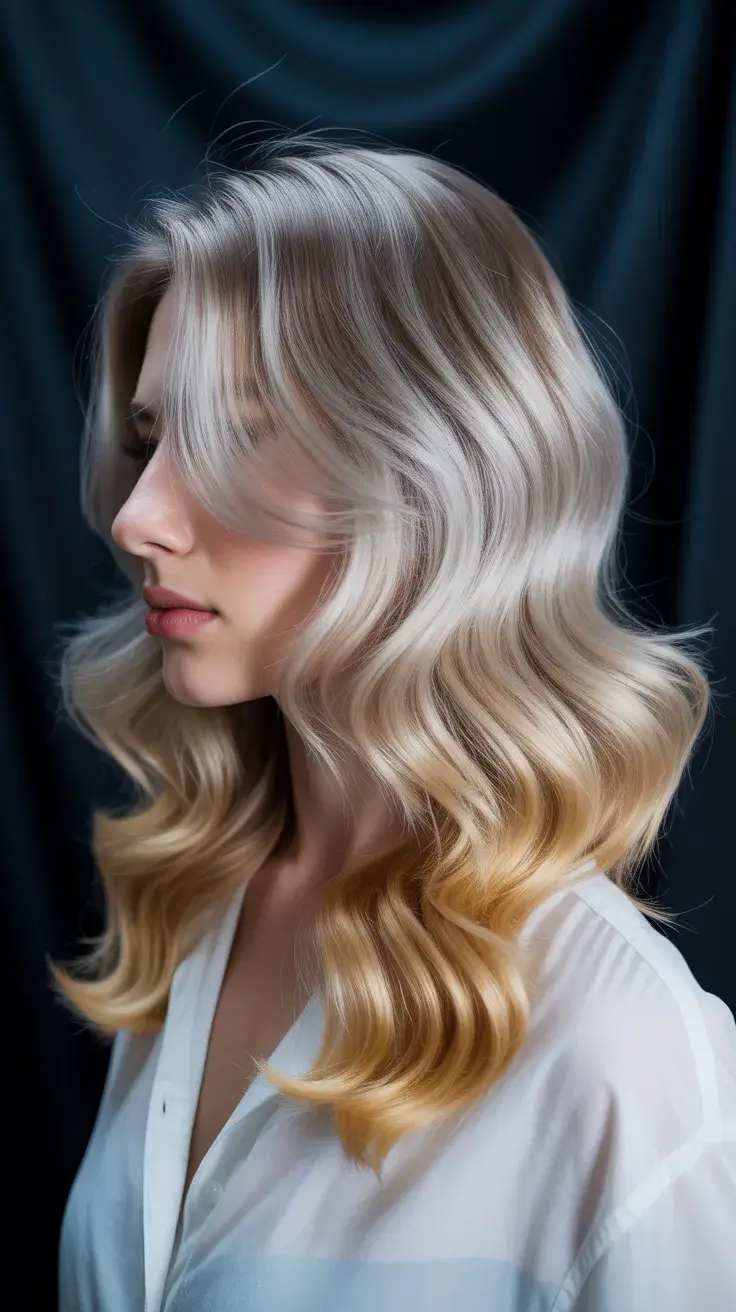 This one leans more classic – a seamless blend from soft neutral roots into luminous Blonde ends. The waves are smooth, almost liquid, and the color melt feels expensive in that understated way. It’s the kind of look that works for literally any setting.