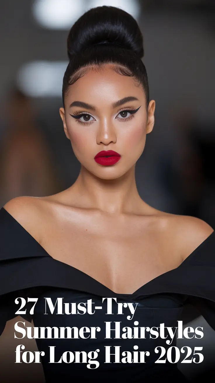 This sculpted updo is all Old Hollywood with the 2025 edge. Structured, smooth, and shiny – this is the type of style that has come out of a couture show but is still appropriate for a classy dinner or even a wedding. The front wave detail instantly adds vintage drama, but the tucked-back texture keeps it current.