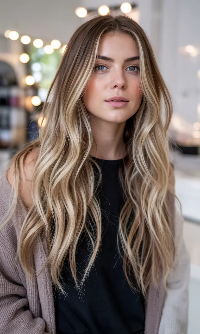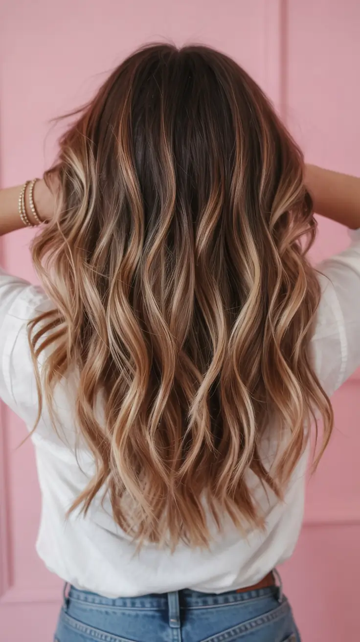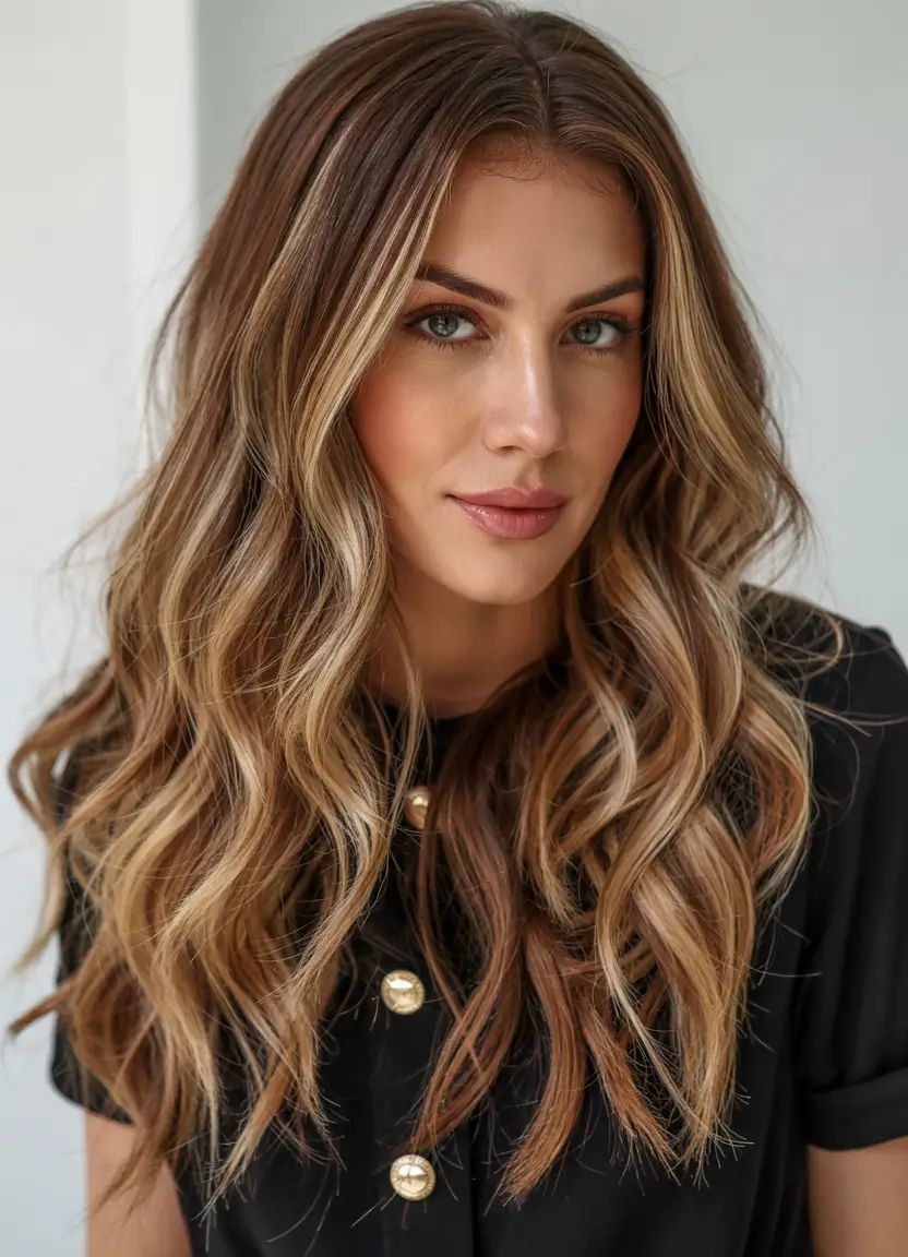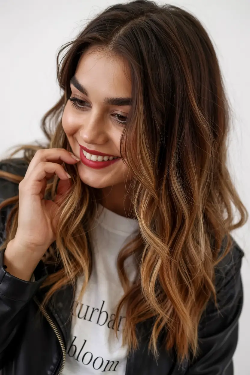 A brown base with soft blonde highlights creates a gorgeous ombre effect with luxurious depth. When the waves run free in long lengths, they serve to build up the colors while creating a naturally light look. This method works well for brunettes who want to achieve lighter tones without going completely blonde. This look has a perfect balance that allows people to use it every day.