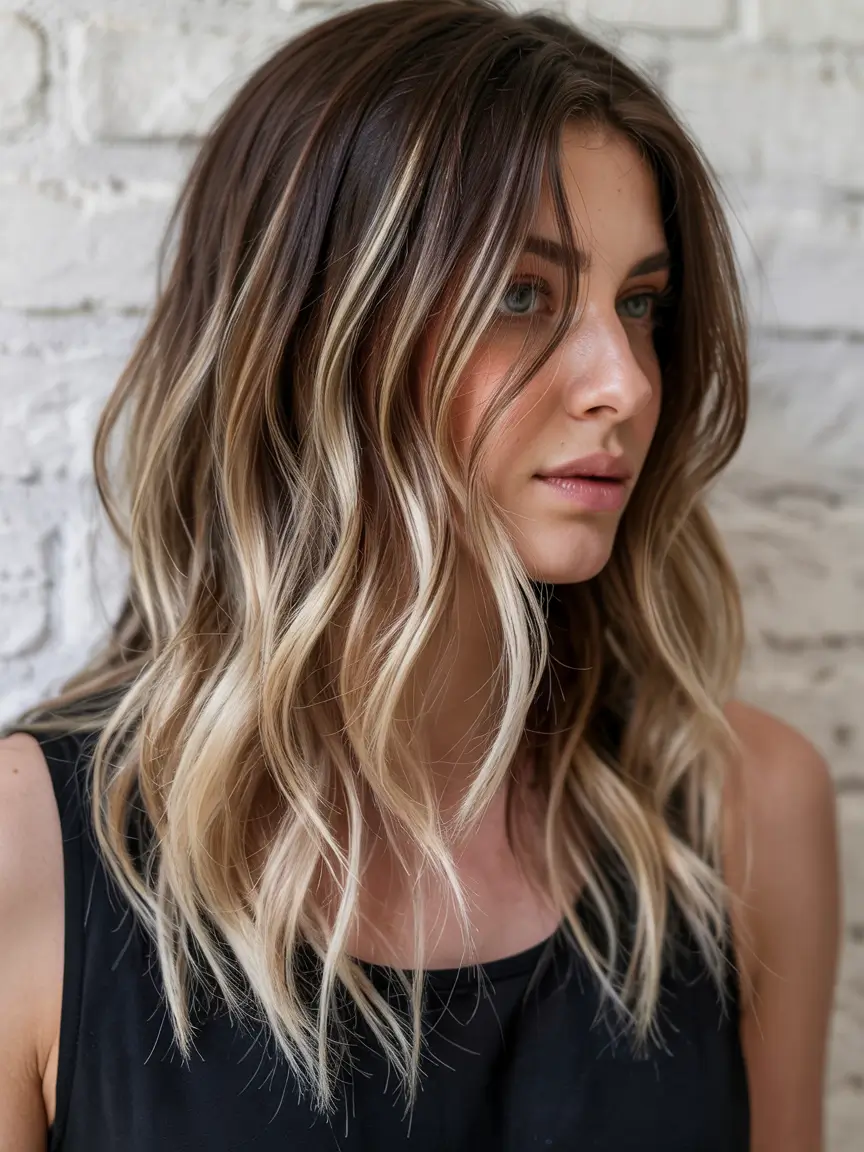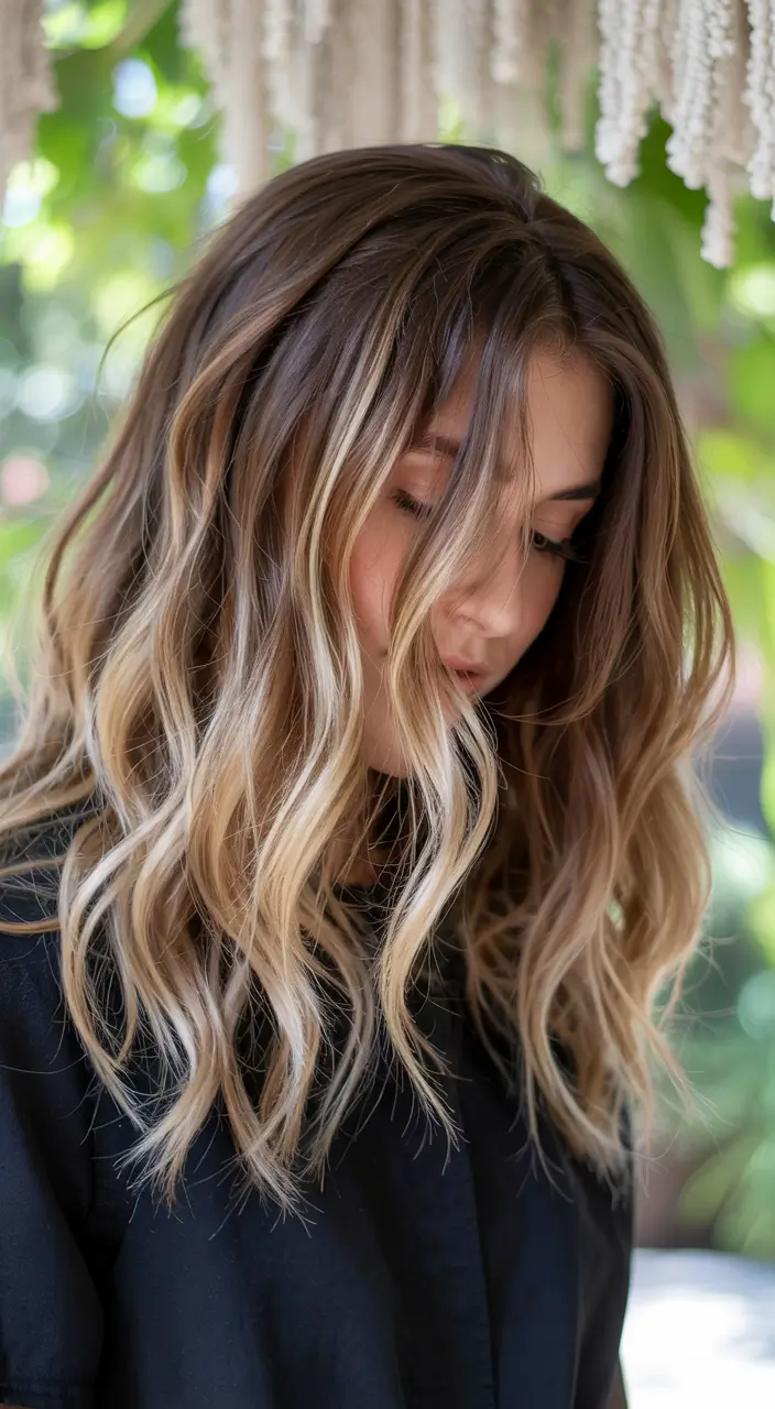 This ombre takes warm browns from the roots and gracefully transitions into light blondes and ash highlights. The waves of texture add natural movement and dimensional depth to this tone. The combination works well for brunettes who want to enhance their appearance with lightness without losing their grounded elegance. An effortless choice for both casual days and special occasions.
