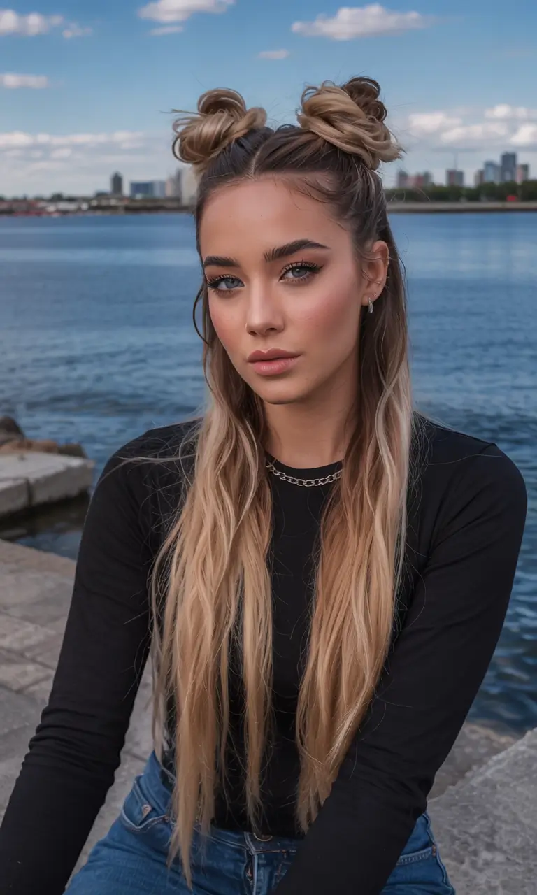 This eye-catching style features clean transitions from brown to white on ultra-long lengths. The half-up space bun style successfully blends contemporary fashion with an elegant look. The contrasting light portion of this color creates a noticeable pop that is perfect for summer photos and events. Ombre shades that present a youthful approach designed for the 2025 summer season.
