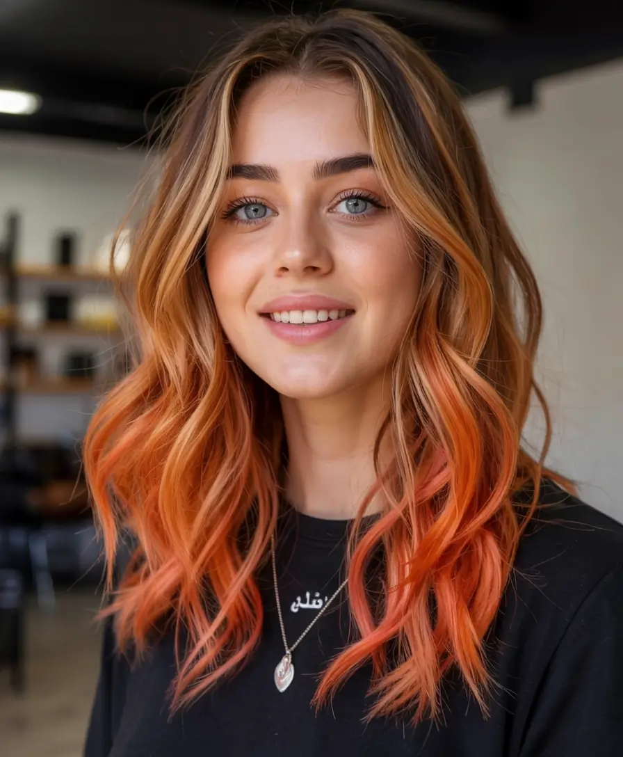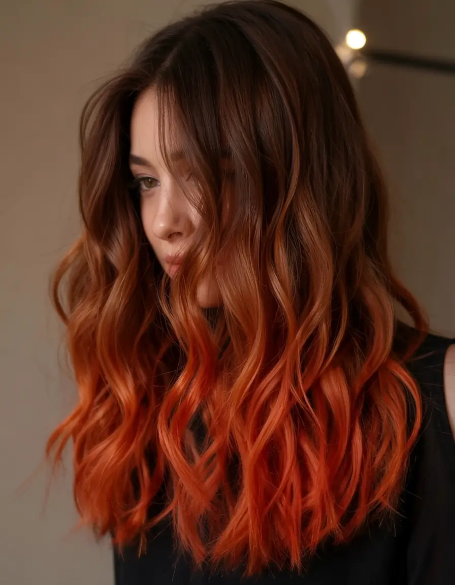 Light passing through this color blend burns from rich dark brown near the scalp to vibrant copper and orange toward the tips in a warm sunset pattern. The soft waves showcase this natural color combination that creates movement along with bright intensity. This eye-catching color selection is for those who want intense reds with a summery vibrancy. The style works for shoulder to mid-length hair that wants both boldness and a golden glow.